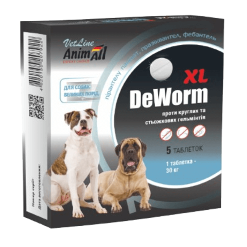 Анімал ВетЛайн ДеВорм XL антигельмінтний препарат для великих собак (5 таб)Застосування:Лікувально-профілактична дегельмінтизація собак при цестодозах (Dipylidium caninum, Taenia pisiformis, T. hydatigera, Echinococcus granulosus, Multiceps multicept та ін.), нематодозах (Ancylostoma caninum, Uncinaria stenocephala, Toxocara canis, Toxocaris leonine).Дозування:Препарат задають тваринам індивідуально одноразово з невеликою кількістю корму (ковбаса, м’ясо, фарш, каша) у подрібненому вигляді або примусово на корінь язика у дозах:Вид тварин Маса тіла тварин, кг Дозування, таблеткиСобаки 20 1 20 – 40 2 40 – 60 3Профілактичну дегельмінтизацію проводити один раз у квартал.Склад:Одна таблетка (1 г) містить діючі речовини: пірантелу памоат – 300 мг, празіквантел – 100 мг, фебантель – 300 мг. Допоміжні речовини: стеарат кальцію, лактоза.Фармакологічні властивості:ATCvet QP52A, антигельмінтні ветеринарні препарати (QP52AА51, празіквантел, комбінації)Препарат належить до комбінованих антигельмінтних препаратів. Комбінація празіквантелу, пірантелу памоату та фебантелю забезпечує широкий спектр антигельмінтної дії щодо круглих і стьожкових гельмінтів: Toxocara canis, Toxocara mistax, Toxascaris leonine, Uncinaria stenocephala, Trichuris vulpis, Ancylostoma caninum, Echinococcus granulosus, Alveococus multilocularis, Mesocestoides lineatus, Dipylidium caninum, Diphyllobotrium latum, Multiceps multiceps.Механізм дії празіквантелу та пірантелу, що входять до складу препарату, грунтується на інгібуванні фумаратредуктази, стійкої деполяризації м’язових клітин гельмінтів, порушенні енергетичного обміну, що викликає їх параліч і загибель, сприяє їх виведенню з шлунково-кишкового тракту.Пірантелу памоат діє як холінергічний антагоніст, викликаючи спастичний параліч нематод (круглих гельмінтів) шляхом деполяризації нервово-м′язової блокади.Празіквантел діє на цестоди (стьожкові гельмінти), швидко всмоктується зовнішньою оболонкою гельмінтів, підвищує проникність мембран для іонів кальцію, викликаючи підвищення м’язової активності, що призводить до скорочення мускулатури та спастичного паралічу, руйнування зовнішнього покриву цестод.Механізм дії фебантелю, що входить до складу препарату, заснован на порушенні транспорту глюкози та мікротубулярної функції паразиту, інгібіруванні фумаратредуктази та синтезу АТФ, підвищенні проникності клітинних мембран, що в свою чергу призводить до порушення м’язової іннервації, паралічу, загибелі паразиту та сприяє елімінації з шлунково-кишкового тракту.Протипоказання:Підвищена індивідуальна чутливість до компонентів препарату!Не застосовувати виснаженим та хворим на інфекційні захворювання тваринам!Не застосовувати самкам в першій половині вагітності!Не застосовувати цуценятам!Застереження:Не застосовувати одночасно з піперазином і препаратами, які інгібують холінестеразу.Зберігання:Зберігати препарат у сухому темному, недоступному для дітей і тварин місці, окремо від продуктів харчування та кормів за температури від 0 до 25 0С.Термін придатності: 3 роки.Для застосування у ветеринарній медицині!Вироблено на замовлення та під контролем ТМ AnimAll.Власник реєстраційного посвідчення та дистриб’ютор: ТОВ фірма «Триплекс», вул. Троїцька 21А, м. Дніпро, 61109, Україна www.zoo.triplex.com.ua www.animall.ua E-mail: info.zoo@edinstvo.uaВиробник продукту: ТОВ «НОВА ПЛЮС», вул. Колісниченківська, буд. 7, 61030, м. Харків, Україна.РП: АВ-09291-01-19