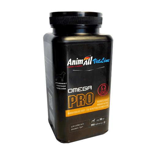 АнімАлл ВетЛайн Омега ПРО (Omega PRO) для великих порід собак250 таб по 2 гПрофілактика станів нестачі вітамінів. Для покращення місцевих процесів обміну речовин в цілому, а також в тканинах суглобів. Для гігантських та крупних порід собак.Активні компоненти препарату є важливою складовою частиною в основних метаболічних процесах та позитивно впливають на всі без виключення процеси в організмі. Застосування препарату дозволяє у мінімальні строки усунути авітамінози та їх наслідки, нормалізує обмін речовин, покращує травлення, перетравлення жирів і вітамінів, як наслідок, покращується загальна кондиція тварини в цілому, стан шкірного покриву і шерсті. Глюкозаміну сульфат та амінокислоти, які входять до складу препарату, дозволяють підтримувати метаболізм у тканинах суглобів, синтез колагену, еластичність та міцність сухожильно-зв’язкового апарату. Комплекс допомагає запобігти порушенням, які пов’язані з дефіцитом поживних речовин у раціоні. У своєму складі має поживні речовини, необхідні для цуценят у період активного росту і розвитку кістяка та для профілактики рахіту.Склад: масло лосося, гідролізат ікри лососевих риб, екстракт Аскофілуму вузловатого (Ascophyllum nodosum), поліненасичені жирні кислоти (Омега-3, Омега-6), глюкозаміну сульфат, вітамінно-мінеральний комплекс, 70% екстракт кормових дріжджів, таурин, насіння льону, пробіотичний комплекс (Lactobacillus, Bifidobacterium bifidum, Streptococcus thermophilus).Склад однієї таблетки (2 г):Компоненти КількістьГідролізат ікри лососевих риб 0,02 гЕкстракт Аскофілуму вузловатого 0,002 гОмега-3, Омега-6: Докозагексаєнова кислота 2,43 мгЛінолева кислота 0,052 мгЛіноленова кислота 0,04 мгАрахідонова кислота 0,034 мгГлюкозаміну сульфат 50 мгВітаміни: Вітамін А 480 МОВітамін D3 120 МОВітамін Е 1,2 мгвітамін К3 0,12 мгВітамін В1 0,09 мгВітамін В2 0,3 мгВітамін В3 1,8 мгВітамін В6 0,12 мгВітамін В9 0,03 мгВітамін В12 1,2 мгВітамін Н (біотин) 0,9 мгВітамін РР (нікотинова кислота) 5,5 мгВітамін С 0,9 мгАмінокислоти: Метіонін 0,7 %Треонін 2,3 %Ізолейцин 4,7 %Лейцин 3,1 %Аргінін 1,3 %Лізин 6,8 %Валін 3,08 %Фенілаланін 1,8 %Таурин 0,04 гПробіотичний комплекс 0,01 гНе містить синтетичних смакових домішок і підсилювачів смаку!Дозування: 1 таблетка (2г) на 10 кг маси тіла один раз на добу. Рекомендований курс застосування 60 днів, 30 днів перерва, потім ще курс 60 днів.Паковання: AnimAll VetLine Omega PRO для великих порід собак таблетка 2 г х 250 т.Термін придатності: 18 місяців.Зберігання: зберігати у сухому темному місці при температурі від 0 до 25°С.Виготовлено під контролем та на замовлення ТМ AnimAll.Виробник готового продукту: ТОВ «НОВА ПЛЮС», 61030, м. Харків, вул. Колісниченківська, буд. 7, УкраїнаДистриб’ютор: ТОВ фірма «ТРИПЛЕКС», 49101, м. Дніпро, вул. Троїцька, буд. 21а, Українаwww.animall.ua www.zoo.triplex.com.ua E-mail:info.zoo@ie.net.ua