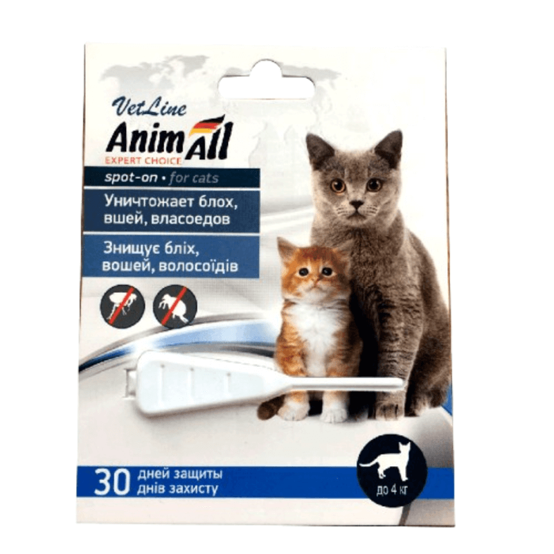 АнімАлл ВетЛайн краплі протипаразитарні для собак та котів до 4 кг, спот-онСклад1 мл препарату містить діючу речовину:імідаклоприд – 100 мгДопоміжні речовини: Н-метилпіролідон, ПЕГ-400.Фармацевтична формаРозчин для зовнішнього застосування, точкового нанесення.Фармакологічні властивостіATCvet QP53, ектопаразитициди, інсектициди і репеленти (АТС vet QP53АХ17, імідаклоприд)Імідаклоприд, діюча речовина препарату, належить до групи хлорнікотинілових сполук. Блокує постсинаптичні холінергічні рецептори, які чутливі до нікотину і розміщені у ектопаразитів у центральній нервовій системі. Переривання передачі нервового імпульсу призводить до паралічу та загибелі паразиту.Імідаклоприд має низький рівень проникнення через гематоенцефалічний бар’єр, тому практично не впливає на ЦНС ссавців.Показання до застосуванняПрофілактика та лікування собак і котів за ураження блохами (Ctenocephalus canis, Ctenocephalus felis, Pulex irritans), вошами (Linognathus setosus) волосоїдами (Trichodectes canis, Felicola subrostratus) та паразитиформними кліщами (Ixodes spp., Rhipicephalus spp., Haemaphysalis spp., Dermacentor spp.) на імагінальній, німфальній та личинковій стадіях розвитку.ПротипоказанняПротипоказанням до застосування є індивідуальна підвищена чутливість тварини до компонентів препарату.Не застосовують хворим, виснаженим та ослабленим тваринам.Не застосовують молодим тваринам віком до 8 тижнів.Не застосовують самкам під час лактації і вагітності.Побічна діяУ тварин із підвищеною чутливістю до діючих речовин при застосуванні препарату можливе подразнення шкіри.Особливі застереження при використанніПри обробці тварин препаратом не допускати потрапляння препарату в очі, ротову порожнину. Після обробки тварини не допускати її контакту з іншими тваринами до повного висихання шерсті.Використання під час вагітності, лактації, несучостіНе застосовують самкам під час лактації і вагітності!Взаємодія з іншими засобами та інші форми взаємодіїНе встановлена.Дози і способи введення тваринам різного вікуДля собак і котів різної маси тіла використовують піпетки-крапельниці препарату відповідного об’єму: