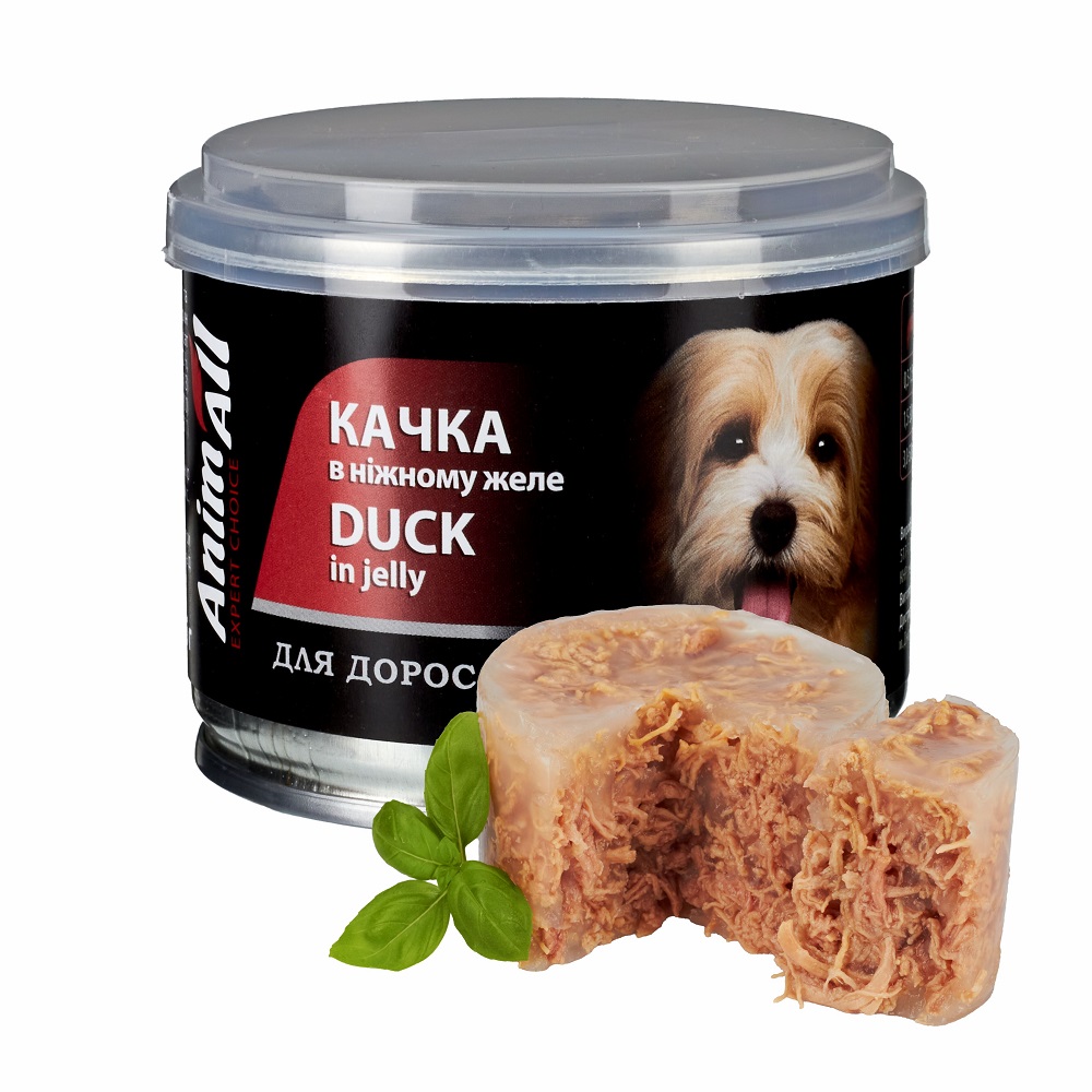 АнімАлл Вологий корм для собак Качка у ніжному желе, 195 г.Наш консервований корм для собак зі свіжим м’ясом качки у желе – це справжнє задоволення для вашого улюбленця. Ми використовуємо найсвіжіше м’ясо, щоб забезпечити вашому собаці найвищу якість харчування.Наш консервований корм також занурений у соковите желе, яке надає йому чудову текстуру та покращує смакові відчуття. Це забезпечує смачну та освіжаючу їжу, якою ваш собака буде насолоджуватися з кожним ковтком.Ми піклуємося про здоров’я вашого собаки, тому наш консервований корм містить важливі вітаміни та мінерали, які підтримують оптимальну фізичну форму та імунітет. Ми також виключаємо використання штучних барвників, ароматизаторів і консервантів, щоб забезпечити природність і безпеку харчування вашого собаки.Запропонуйте вашому собаці наш консервований корм зі свіжим м’ясом качки у желе і переконайтесь, що він отримує найкращі інгредієнти для здорового та задоволеного життя. Ваш собака буде вдячний за цей смачний та поживний раціон, який стане для нього справжньою насолодою.Головні інгредієнти: м’ясо качки 70,0%, вода 29,6%.Амінокіслоти та вітаміни: таурин (3A370) 0,1%, вітамін A (3A672b) 0,03%, вітамін E (3A700) 0,02%, вітамін B1 (3A820) 0,001%, вітамін D3 0,002%, (3A671), вітамін K3 (3a711) 0,002%.Гарантований склад: білок (мін) 6,5%, жир (мін) 2,00%, зола (макс) 2,00%, клітковина (макс) 1,50%, волога (макс) 84,0%.Виготовлено на замовлення та під контролем TM AnimAll.Вироблено: Китай.