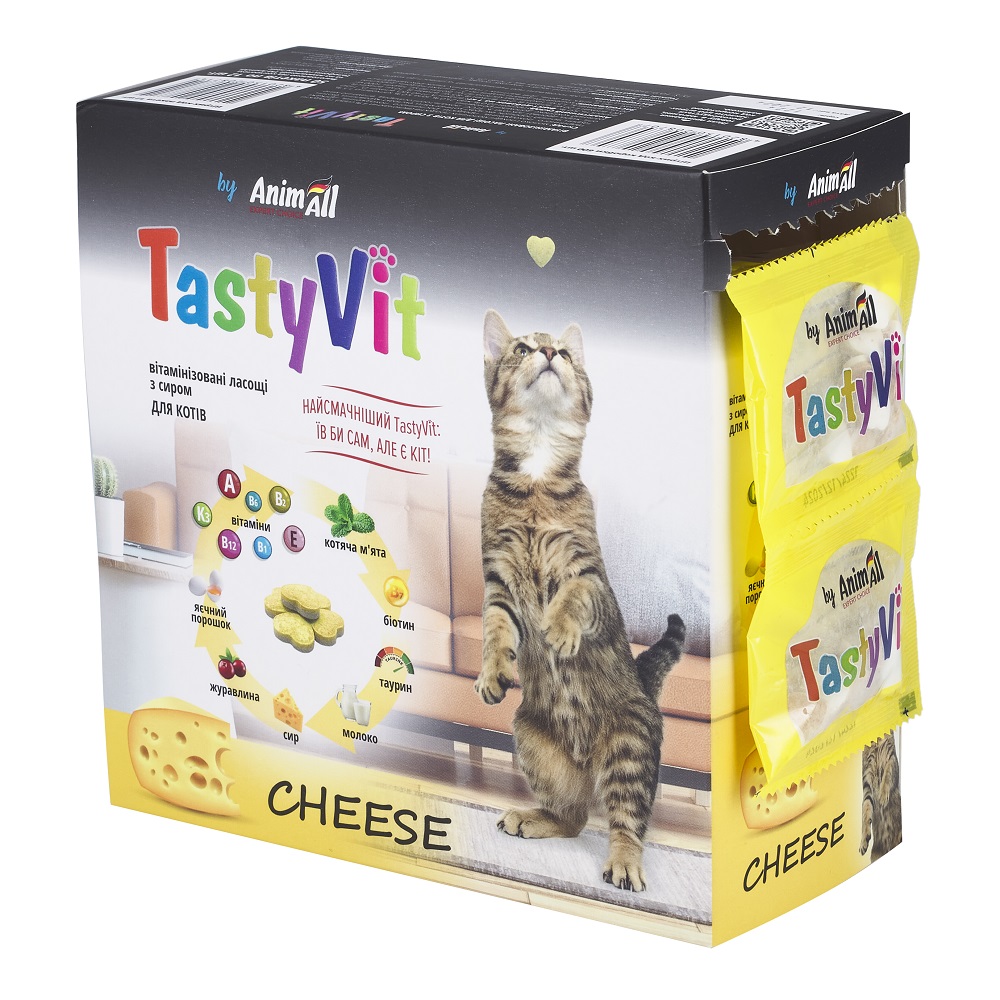 AnimAll TastyVit вітамінізовані ласощідля котів з сиромДля досягнення балансу вітамінів коти споживають рослини, які не лише надають їм енергії, але й підсилюють природні інстинкти. Для домашніх тварин цей ефект можна досягти за допомогою спеціальних вітамінізованих ласощів, які впливають на стан та активність Вашого котика.Вітамінізовані ласощі для котів з сиром – ідеальний спосіб підтримати здоров’я та радість Вашого пухнастого улюбленця.Переваги:• Підходять як для дорослих котів, так і для кошенят.• Являють собою цінну комбінацію вітамінів, завдяки чому ласощі позитивно позначаються на стані шкіри, шерсті та роботі травної системи кота.• Містять необхідні речовини, які організм улюбленця не завжди отримує з основною їжею (такі як таурин) і тим самим може наражати себе на ризик виникнення небезпечних захворювань.• Включають в себе баластові речовини ТГОС, що стимулюють апетит і покращують роботу кишківника.• Також у складі є котяча м’ята, яка виступає для багатьох котів природним атрактантом, а також позитивно впливає на їхній настрій та самопочуття.• І журавлина, яка профілактує захворювання сечовидільної системи.• Неповторний смак сиру для справжніх гурманів.• Зручне та компактне фасування та дозування, 50 пакетів по 12 шт.: можна взяти з собою на прогулянку, у подорож, до ветеринарного лікаря, грумера або у гості.Склад: молоко і похідні молочних продуктів (включаючи 4 % сиру), продукти тваринного походження, продукти рослинного походження, дріжджі, таурин, яєчний порошок, екстракт котячої м’яти, екстракт журавлини, біотин, олії, жири, дериват лактози з ТГОС, ізомальтоолігосахарид, вітамінно-мінеральний комплекс, допоміжні речовини.Аналітичний склад: протеїн 22,0 %, жир 25,0 %, зола 5,0 %, клітковина 1,5 %, вологість 5,0%. Вміст добавок на 1 кг: вітамін А 7140 МО, вітамін D3 1450 МО, вітамін Е 20 мг, вітамін В1 2 мг, вітамін В2 8,5 мг, вітамін В6 10 мг, вітамін В12 20 мг, вітамін К3 1,5 мг, нікотинова кислота 42 мг, біотин 40 мг, таурин 1000 мг.Застосування: кошенятам давати щодня по 2 – 4 таблетки на день, дорослим котам – до 6 таблеток на день. Для вагітних і годуючих кішок рекомендується подвійна доза.Застереження: не застосовувати при індивідуальній чутливості до компонентів засобу.Умови зберігання: зберігати засіб у темному сухому приміщенні, окремо від харчових продуктів при температурі від 5 °С до 25 °С.Термін придатності: 18 місяців.Країна виробник: УкраїнаНайсмачніший TastyVіt: їв би сам, але є кіт!