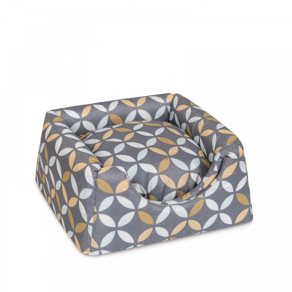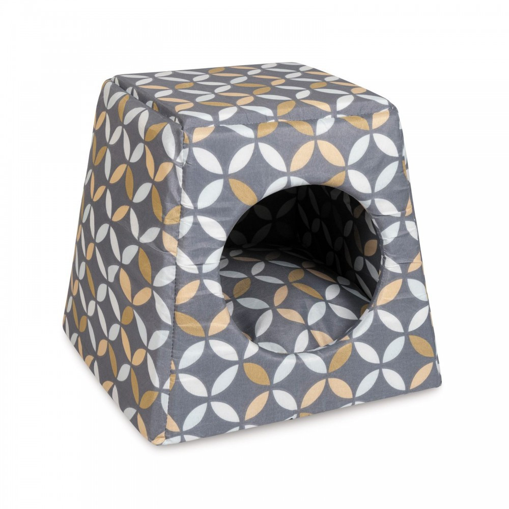 Практичний будиночок з м’якої бавовняної тканини сподобається не тільки котам, а й невеликим собакам. Цуценята і кошенята також будуть задоволені. Лежак-трансформер можна використовувати в 2 положеннях: як будиночок з круглим входом і м’якою подушкою всередині або як лежак-диван – потрібно лише натиснути долонею на «дах» будиночка, попередньо вийнявши з нього подушку, а потім покласти її назад до лежака.Переваги моделі:2 в 1: будиночок і диванчикзнімна подушка з синтепоновим наповнювачем, яку можна прати вручнулежак добре чиститься валиком або щіткоюуніверсальний дизайн, стильний геометричний малюнок тканини.Матеріал: бязь, поролон, синтепон.Розмір: 36х36х32 см.