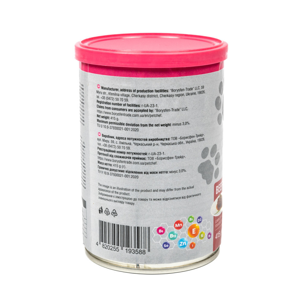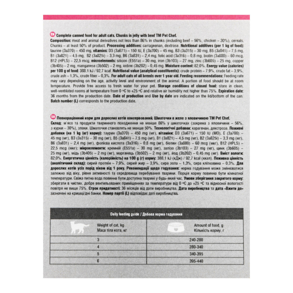 М’ясні шматочки в желе Pet Chef — це збалансований повнораціонний вологий корм для дорослих котів, який є чудовим вибором для тих, хто хоче забезпечити своїх улюбленців смачним та поживним раціоном. Кожен шматочок корму містить мінімум 85% м’ясних інгредієнтів, що задовольнить потреби тварини у білках та енергії, а також оптимальну комбінацію макро- і мікроелементів, вітамінів і амінокислот, необхідних для її розвитку та загального здоров’я. Желе підсилює апетитність, роблячи кожен шматочок надзвичайно соковитим і ароматним.М’ясні шматочки Pet Chef містять таурин – незамінну амінокислоту, яку котячий організм самостійно не виробляє й отримує тільки у складі їжі.В складі корму відсутні барвники, рослинні білки і жири, м’ясо-кісткове борошно.Цей корм підходить для щоденного годування та є ідеальним рішенням щодо збалансованого харчування вашого улюбленця.Банки мають пластикові кришки для збереження свіжості після відкривання.Склад: м’ясо та продукти тваринного походження не менше 86% у шматочках (зокрема з курки – 55%, з яловичини – 26%, з індички – 5%), злаки. Шматочки становлять не менше 50%.Поживні добавки (на 1 kg (кг) корму): таурин (3а370) – 450 mg (мг), вітаміни: D3 (3а671) – 150 IU (МО), Е (3а700) – 45 mg (мг), В3 (3а315) – 30 mg (мг), В5 (3а841) – 7,5 mg (мг), В1 (3а821) – 4,5 mg (мг), В2 (3а825і) – 3,3 mg (мг), В6 (3а831) – 2,4 mg (мг), фолієва кислота (3а316) – 0,8 mg (мг), біотин (3а880) – 60 mcg (мкг), В12 (HPLS) – 22,5 mcg (мкг); мікроелементи: кремній (Е551а) – 30 mg (мг), залізо (3b103) – 27 mg (мг), цинк (3b605) – 25 mg (мг), мідь (3b405) – 2 mg (мг), марганець (3b502) – 2 mg (мг), йод (3b202) – 0,45 mg (мг).Технологічні добавки: карагенан, декстроза.Енергетична цінність (калорійність) на 100 g (г) корму: 388,5 kJ (кДж) / 92,8 kcal (ккал).Поживна цінність (аналітичний склад): сирий протеїн – 7,9%, сирий жир – 3,9%, сира зола – 1,3%, сира клітковина – 0,3%.Вміст вологи: 82,0 %.Для дорослих котів усіх порід віком від 1 року.Добова норма годування:Для дорослих котів з масою тіла 3 кг: 240-280 г.Для дорослих котів з масою тіла 4 кг: 280-340 г;Для дорослих котів з масою тіла 5 кг: 340-395 г;Для дорослих котів з масою тіла 6 кг: 395-440 г.Рекомендації щодо годування: норма годування може змінюватися залежно від віку, рівня активності та середовища перебування тварини. Порція корму повинна бути кімнатної температури. Свіжа питна вода повинна бути доступна тварині у будь-який час.Умови зберігання закритого корму: зберігати в чистих, добре вентильованих приміщеннях за температури від 0 ºС до +25 ºС та відносної вологості повітря не вище 75%.