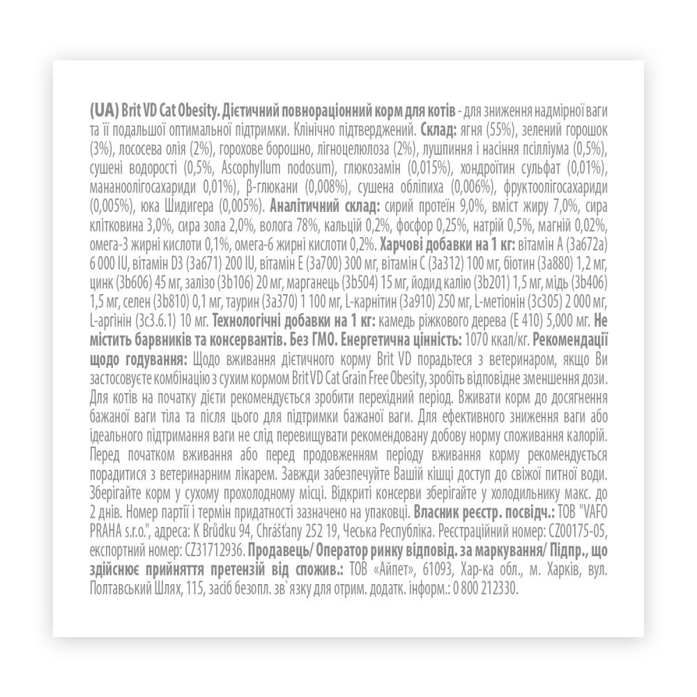 Повнораціонний і збалансований дієтичний корм для контролю надлишкової маси тіла у котів.Показання:допомагає схуднути котам із зайвою вагою і ожирінням;підтримує оптимальну масу тіла та фізичний стан;дієта підходить для котів із цукровим діабетом, які мають зайву вагу;коліт і діарея, спричинена чутливістю до клітковини.Протипоказання:кошенят;вагітних або годуючих кішок.Переваги:відсутність ризику виникнення алергії на глютен або глютенової ентеропатії й профілактика ожиріння;підтримує відчуття ситості й знижує апетит;протизапальна дія та антиоксидантний захист тканин;підтримує м’язову масу, фізичний стан і суглобові хрящі.Спосіб застосування:Зниження надлишкової маси тіла:Визначте оптимальну вагу для кота відповідно до його породи і відрегулюйте кількість Brit VD Obesity Cat, яку ви будете давати в день з розрахунку, щоб він втрачав 1–2 % маси тіла на тиждень. Щоб забезпечити безпечний та ефективний процес схуднення, масу тіла кота необхідно регулярно перевіряти. Початковий період споживання котом дієти Brit VD Obesity Cat повинен тривати не менше 2-х місяців. Не давайте ніякого іншого корму або ласощів для котів, їжі для людей.Підтримання оптимальної маси тіла:Після досягнення бажаної маси тіла, давайте коту скориговану кількість Brit VD Obesity Cat ще протягом 6 місяців або на довгостроковій основі.Інструкція з годування:Проконсультуйтеся з ветеринаром з приводу використання дієтичного корму Brit VD – якщо він поєднується з сухим кормом Brit VD Cat Grain Free Obesity, зменшуйте дозу відповідно. Для котів, під час переходу на дієту, рекомендується адаптивний період. Продовжуйте давати корм, поки не буде досягнуто бажаного зменшення ваги, і далі, якщо потрібно, для підтримання оптимальної маси тіла. Для ефективного схуднення або ідеальної підтримки ваги не перевищуйте рекомендоване денне споживання калорій. Перед застосуванням або перед продовженням періоду використання рекомендується отримати висновок ветеринара. Переконайтеся, що кіт завжди має доступ до свіжої питної води.Склад: ягня (55 %), зелений горошок (3 %), лососева олія (2 %), горохове борошно, лігноцелюлоза (2 %), лушпиння і насіння псілліума (0,5 %), сушені водорості (0,5 %, Ascophyllum nodosum), глюкозамін (0,015 %), хондроїтин сульфат (0,01 %), мананолігосахариди (0,01 %), β-глюкани (0,008 %), сушена обліпиха (0,006 %), фруктоолігосахариди (0,005 %), юка Шидігера (0,005 %).Аналітичні компоненти:сирий білок 9,0 %, вміст жиру 7,0 %, сира зола 2,0 %, вологість 78,0 %, сира клітковина 3,0 %, кальцій 0,2 %, фосфор 0,25 %, натрій 0,5 %, магній 0,02 %, калій 0,3 %, омега-3 0,1 %, омега-6 0,2 %.Харчові добавки на 1 кг:вітамін А 6 000 МО, вітамін D3 200 МО, вітамін Е 300 мг, вітамін С 100 мг, біотин 1,2 мг, цинк 45 мг, залізо 20 мг, марганець 15 мг, йодид калію 1,5 мг, мідь 1,5 %, селен 0,1 мг, таурин 1100 мг, L-карнітин 250 мг, L-метіонін 2 000 мг, L-аргінін 10 мг.Енергетична цінність:1 070 ккал/кгВага котаДобова норма2 кг200 г4 кг350 г6 кг450 г10 кг600 г