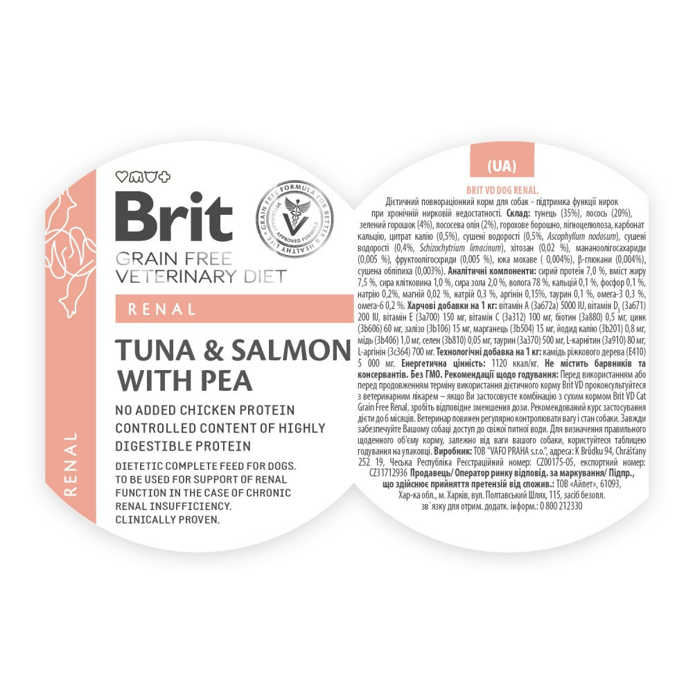 Повноцінний і збалансований дієтичний корм для собак, які страждають порушенням функції нирок.Показання:нутритивна підтримка собак із хронічною нирковою недостатністю;дієта підходить для собак із кардіоренальним синдромом;низький вміст пуринів при уратному та цистиновому уролітазі.Не підходить для:цуценят;вагітних або годуючих собак.Переваги:легкозасвоюваний білок для підтримання м’язової маси та фізичного стану;пригнічує всмоктування фосфору в кишечнику;відсутність ризику виникнення алергії на глютен або глютенової ентеропатії;низький глікемічний індекс для профілактики ожиріння;протизапальна дія та антиоксидантний захист тканин.Спосіб використання:Хронічна недостатність нирок:Більшість собак із хронічними захворюваннями нирок страждають втратою апетиту або анорексією, спричиненою впливом уремічних токсинів на слизову оболонку шлунково-кишкового тракту. При анорексії катаболізм білків збільшує вироблення уремічних токсинів, погіршуючи фізичний стан. Прийом їжі має підтримуватися, і необхідно поступово переходити зі звичної їжі вашого собаки до корму Brit GF VetDiet Renal.Інструкція з годування.Проконсультуйтеся з ветеринаром з приводу використання дієтичного корму Brit VD – якщо він поєднується з сухим кормом Brit GF VetDiet Renal, зменшуйте дозу відповідно. Початковий період годування повинен тривати не менше 6 місяців. Перед використанням або перед продовженням терміну використання рекомендується проконсультуватися з ветеринаром. Переконайтеся, що собака завжди має доступ до свіжої питної води. Зберігати в сухому та прохолодному місці. Після відкриття зберігайте банку в холодильнику і використайте її протягом 2 днів. Термін придатності та номер партії знаходяться на дні упаковки.Склад: тунець (35 %), лосось (20 %), зелений горошок (4 %), масло лосося (2 %), горохове борошно, карбонат кальцію, цитрат калію (0,5 %) сушені водорості, хітозан (0,02 %), мананолігосахариди (0,005 %), фруктоолігосахариди (0, 005 %) юка шидігера (0,004 %), β-глюкани (0,004 %), обліпиха (0,003 %).Аналітичні компоненти:сирий протеїн 7,0 %, сирий жир 7,5 %, сира зола 2,0 % вологість 78,0 %, сира клітковина 1,0 %, кальцій 0,1 %, фосфор 0,1 %, калій 0,3 %, аргінін 0,15 %, таурин 0,1 %, омега-3 0,3 %, омега-6 0,2 %.Харчові добавки на 1 кг:вітамін а 5000 мо, вітамін d3 200 мо, вітамін е 150 мг, вітамін с 100 мг, біотин 0,5 мг, цинк 60 мг, залізо 15 мг, марганець 15 мг, йодид калію 0,8 мг, мідь 1 мг, селен 0,05 мг, таурин 500 мг, l-карнітин 80 мг, l-аргінін 700 мг.Енергетична цінність:1 120 ккал/кгВага собакиДобова норма5-10 кг200-400 г10-30 кг400-800 г30-60 кг800-1400 г