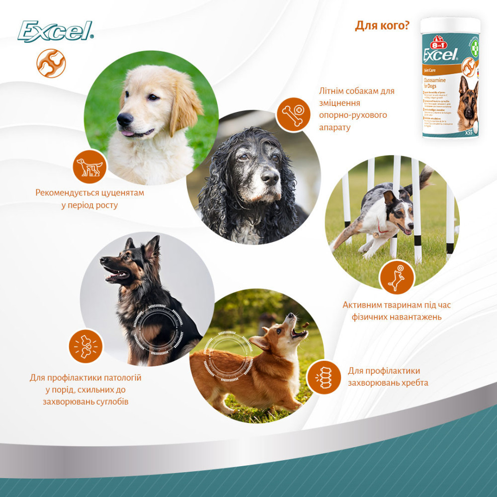 Глюкозамін для собак.Ідеально підходить для дорослих і собак старшого віку.Для підтримки здоров’я суглобів та активного способу життя.Щоденна добавка глюкозаміну для собак.Глюкозамін покращує регенерацію суглобових тканин та захищає хрящі.Стабілізований вітамін С підтримує утворення колагену і сприяє еластичності сполучних тканин, а також зв’язок.Склад:мінеральні речовини. молюски та раки (глюкозамін гідрохлорид 11,3%), стеаринов кислота, магнію стеарат.Аналітичні компоненти:сирий білок 220%. сирі олії та жири 40%, сира клітковина 20%. сира зола 35.0%.Добавки:вітамін С 5000 мг/кг. Не містить штучних консервантів і барвників.Застосування:давати собаці щодня по 1 таблетці на кожні 10 кг ваги тварини. Давайте перед годуванням або змішуйте з кормом.Допускається зміна/корекція дозування за рекомендацією ветеринарного лікаря.