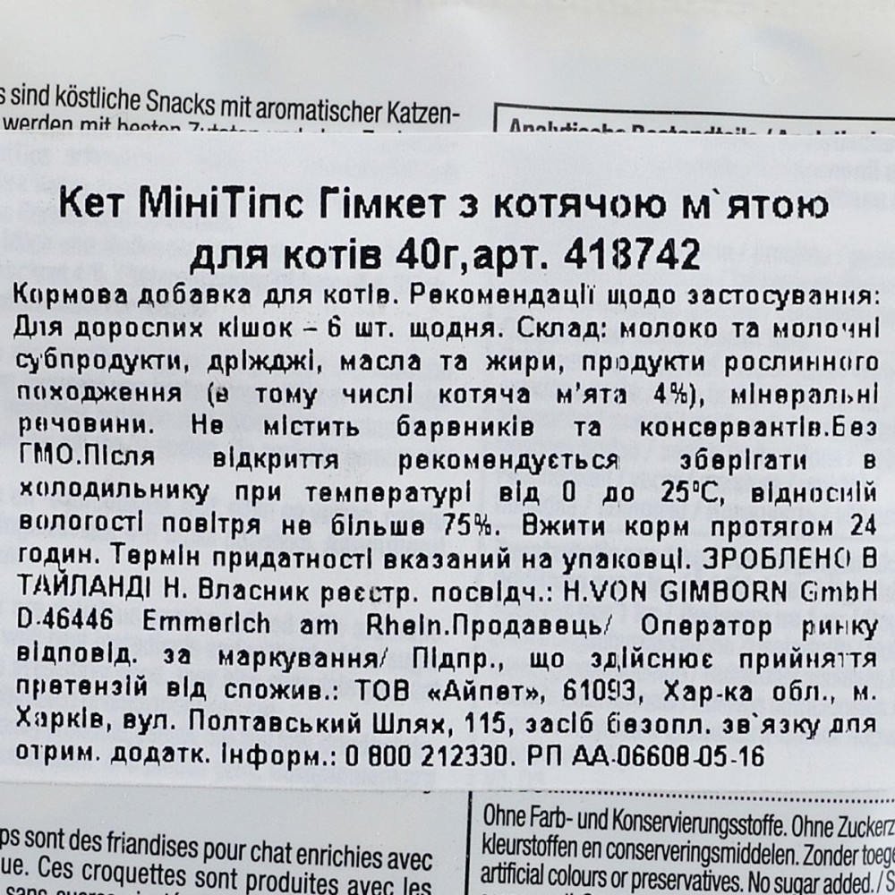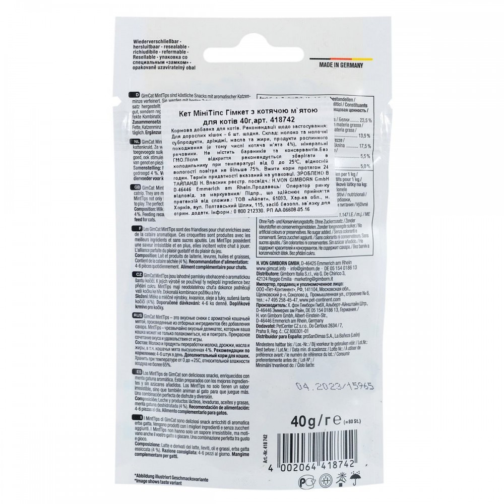 Ласощі GimCat Cat-Mintipsподарують вашому котику море задоволення та веселощів.Ароматна котяча м’ята та відбірні інгредієнти, зроблять їх найулюбленішими снеками вусатого вихованця.Ці ласощі виготовлені без додавання цукру, гарантуючи вашому коту здоровий перекус.Смакові якості роблять їх неперевершеними, а форма стимулює чотирилапого до активних ігор, насичуючи його життя жвавістю та здоров’ям!Рекомендації з годування:щоб забезпечити максимальну користь, рекомендується давати улюбленцю 4-6 шт. щодня.Склад: молоко та молочні продукти, дріжджі, олії та жири, котяча м’ята сушена (4%).Аналітичний склад:білок 23,5%, жир 13,5%, сира зола 5,5%, сира клітковина 17,5%, волога 5%.Харчові добавки на 1 кг:вітамін D3 1.147 МО