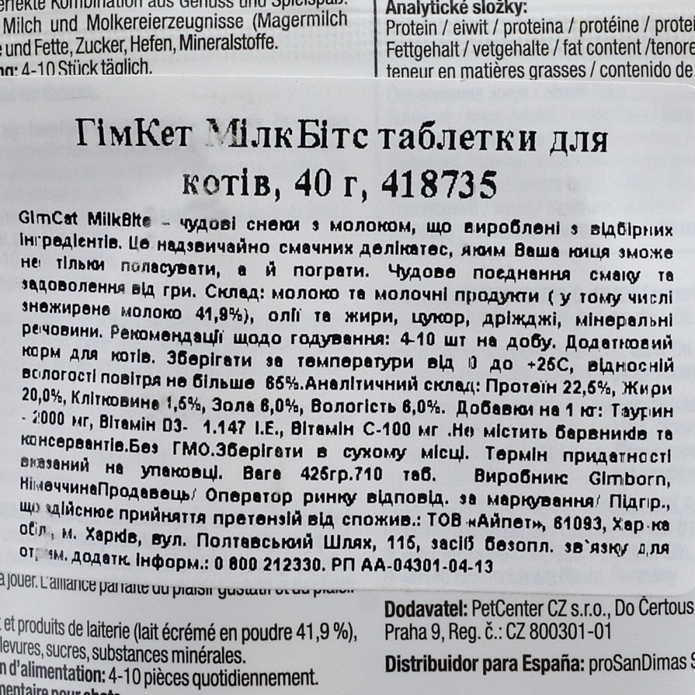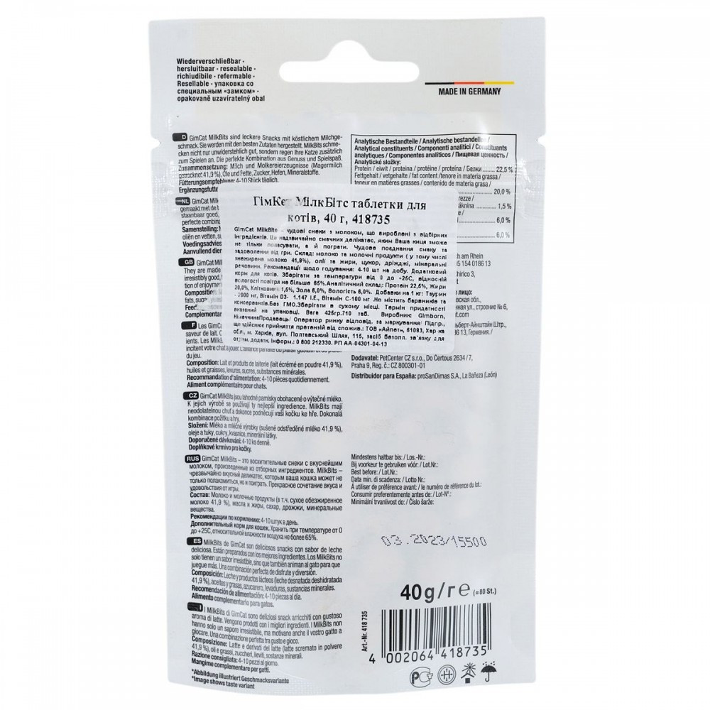 Ласощі GimCat MilkBitsподарують вашому котику море задоволення та веселощів.Цінне молоко та відбірні інгредієнти, зроблять їх найулюбленішими снеками вусатого вихованця.Ці ласощі виготовлені без додавання цукру, гарантуючи вашому коту здоровий перекус.Смакові якості роблять їх неперевершеними, а форма стимулює чотирилапого до активних ігор, насичуючи його життя жвавістю та здоров’ям!Рекомендації з годування:щоб забезпечити максимальну користь, рекомендується давати улюбленцю 4-10 шт. щодня.Склад: молоко та молочні продукти (41,5% сухого молока), олії та жири, цукор, дріжджі, яйця та яєчні продукти, мінеральні поживні речовини.Аналітичний склад:білок 22%, жир 20%, сира зола 6,5%, сира клітковина 1,5%, волога 6%.Харчові добавки на 1 кг:таурин 2000 мг, вітамін D3 1,147 МО, вітмін C 100 мг