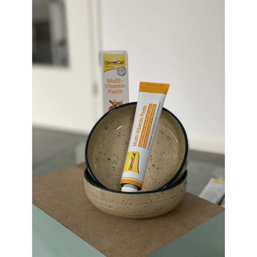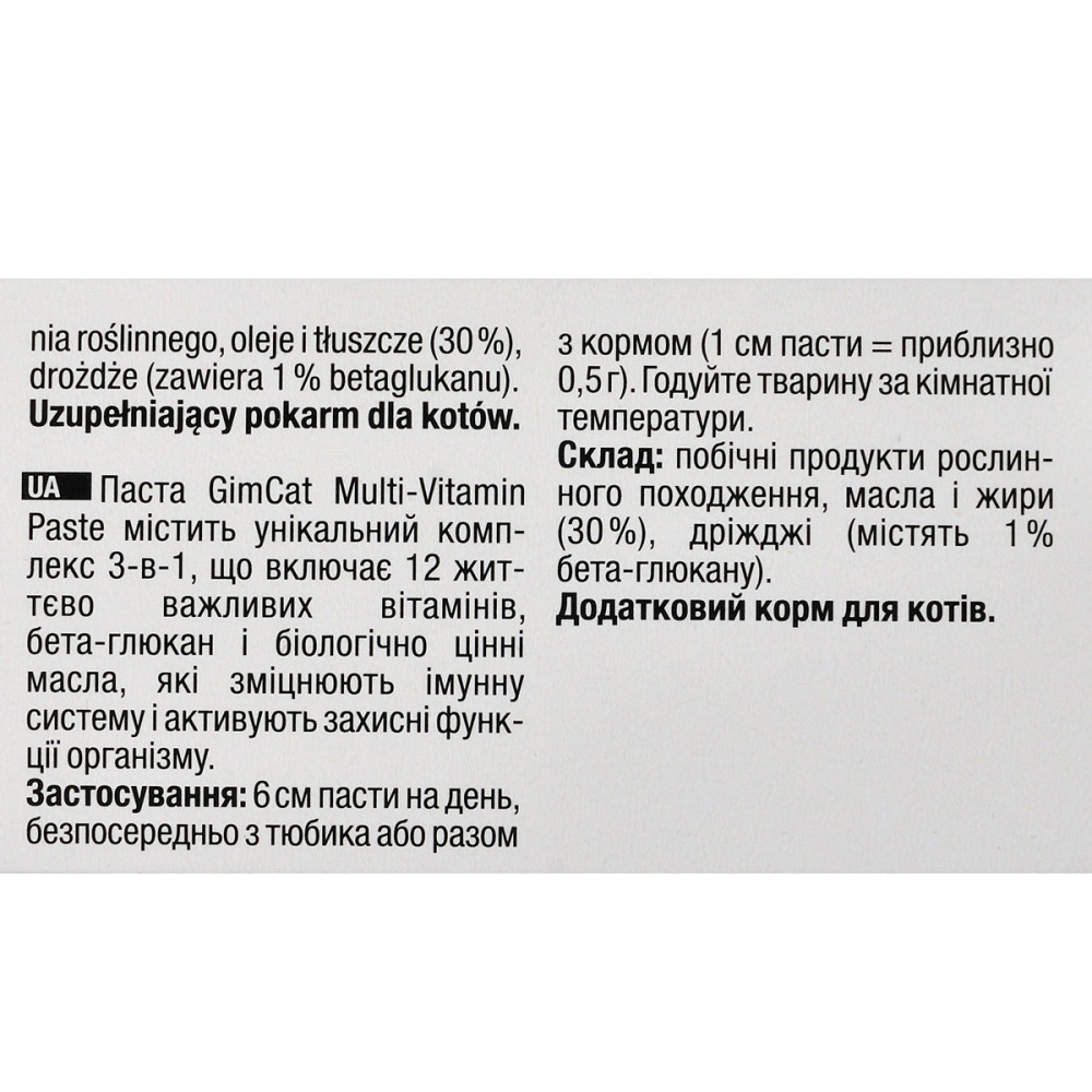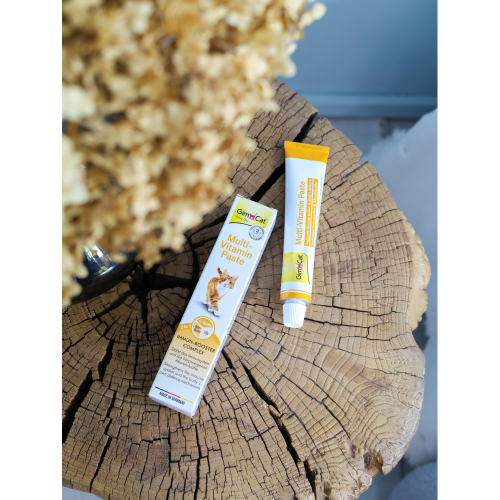 Паста GimCat Every Day Multi-Vitamin Paste для доповнення щоденного раціону і підтримки загального стану здоров’я котів.Паста містить унікальний комплекс 3-в-1, що включає 12 життєво важливих вітамінів, таурин, дріжджову культуру (містить 1% бета-глюкану) і біологічно цінні олії, які зміцнюють імунну систему і активізують захисні функції організму.Рекомендації щодо годування:6 см пасти на день, безпосередньо з тюбика або разом з кормом (1 см пасти = приблизно 0,5 г). Рекомендується використовувати добавку кімнатної температури. Тривалість застосування не обмежена.ГімКет Евері Дей Мультивітамін паста для котів призначена для дорослих котів всіх порід, не призначена для кошенят, не призначена для котів, які мають чутливість до одного або декількох інгредієнтів кормової добавки.Склад: екстракт солоду, рослинні олії (ріпакова олія, лляна олія), інактивована дріжджова культура Saccharomyces cerevisiae, емульгатори (лецитин, гліцерол моностеарат), загущувач (гуміарабік), целюлоза, стабілізатор (діоксид кремнію), вітаміни, таурин