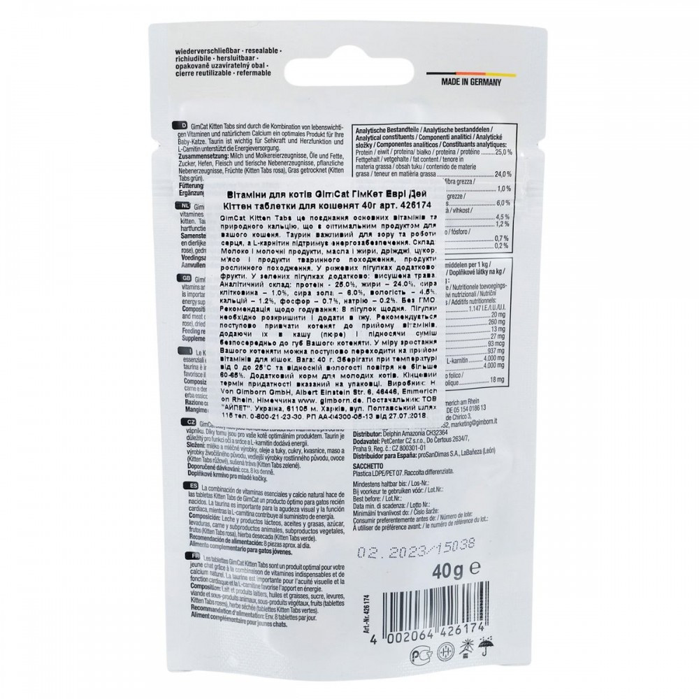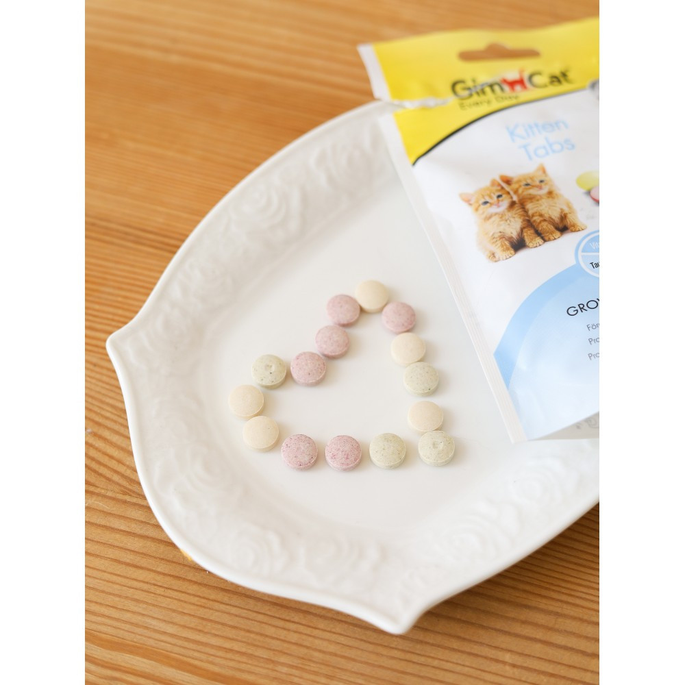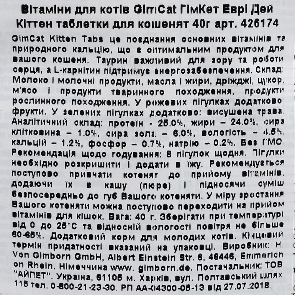 Комбінація життєво необхідних вітамінів та кальцію робить GimCat Kitten Tabs ідеальним продуктом для вашого кошеняти. Таурин важливий для зору та роботи його серця, а L-карнітин підтримує енергійність і життєрадісність малюка.З кальціємЗ L-карнітиномПідвищує життєвий тонусЗ тауриномЗ вітамінамиРекомендація щодо годування:8 пігулок щодня. Пігулки необхідно розкришити і додати в їжу. Рекомендується поступово привчати кошеня до прийому вітамінів, додаючи їх в кашу (пюре) і підносячи суміш безпосередньо до рота кошеняти. У міру зростання улюбленця можна поступово переходити на прийом вітамінів для котів.Склад: Молоко і молочні продукти, олії та жири, дріжджі, цукор, м’ясо і продукти тваринного походження, продукти рослинного походження. У рожевих пігулках додатково: фрукти. У зелених пігулках додатково: висушена трава.Аналітичний склад:протеїн – 25.0%, жири – 24.0%, сира клітковина – 1.0%, сира зола – 6.0%, вологість – 4.5%, кальцій – 1.2%, фосфор – 0.7%, натрію – 0.2%. Без ГМО.