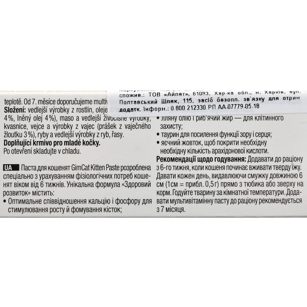 Вітамінізована паста Expert Line Kitten, для кошенят розроблена спеціально для маленьких пухнастих улюбленців, з урахуванням потреб кошенят, віком від шести тижнів. Унікальне поєднання компонентів забезпечує повноцінний розвиток тварин.В складі продукту містяться:кальцій (стимулює ріст та формування кісток)дванадцять вітамінів, мінеральних речовин, мікроелементів (зміцнення імунітету)олія льону, риб’ячий жир (захист кліток)таурин (покращення гостроти зору, нормалізація роботи серця)жовток яєчний.Продукт не містить консервантів, ГМО, повністю готовий до вживання, в якості харчової добавки.Склад: екстракт солоду, ріпакова олія, емульгатори (лецитин, гліцерин), інактивована дріжджова культура Saccharomyces cerevisiae (5,5%), свиняче кісткове борошно, льняне масло (4%), риб’ячий жир (4%), загущувач, порошок яєчного жовтка (2%), гідролізований білковий концентрат білої риби (2%), целюлоза, порошок морських водоростей, стабілізатор, вітаміни, таурин.