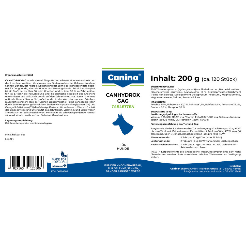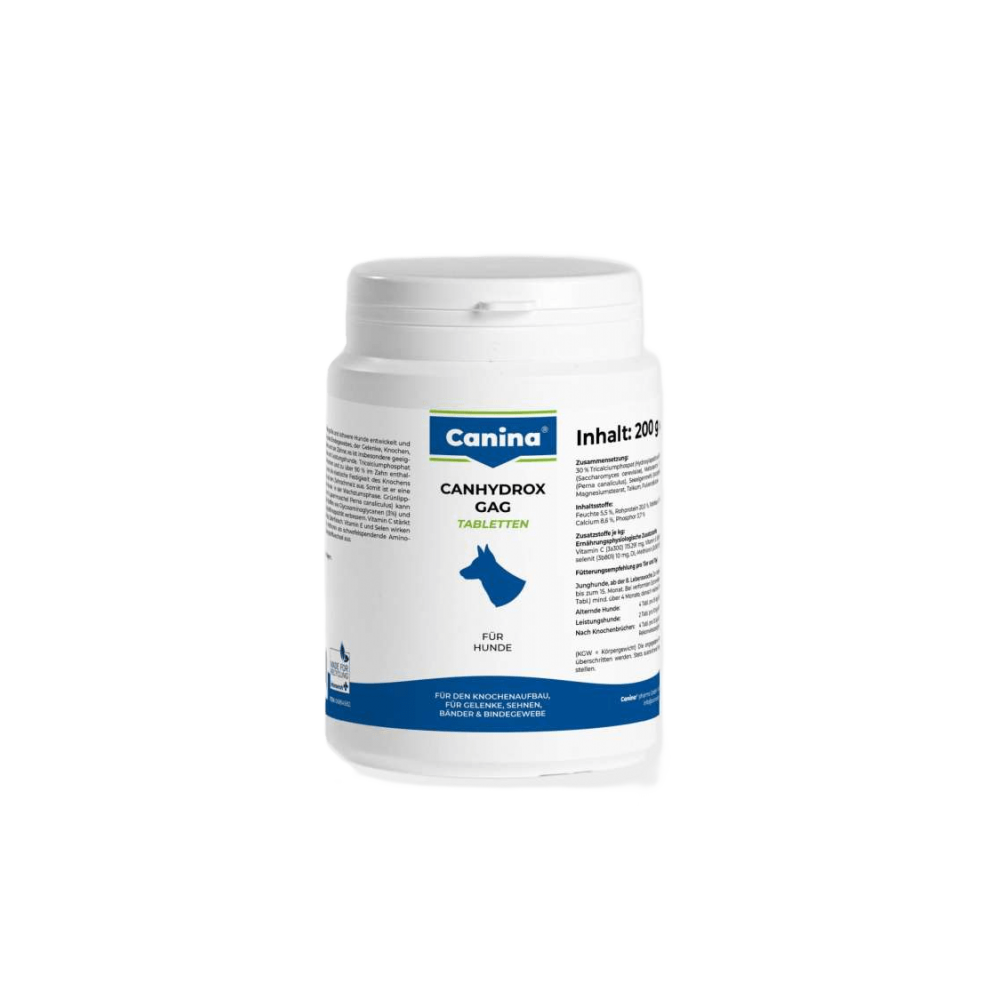 Натуральний продукт, не має аналогів, спеціально розроблений для великих та гігантських порід з урахуванням їх особливостей росту та фізіології. Унікальний склад компонентів, що підсилюють один одного: гідроксиапатит, екстракт зелених губчастих молюсків, кремнієва кислота та вітамін С.Продукт можна давати незалежно від типу годування, бо гідроксиапатит містить необхідний комплекс мінеральних речовин, а також компенсує витрату глікозаміногліканів та не порушує процес метаболізму кальцію та фосфору. Екстракт зелених губчастих молюсків має унікальний хімічний склад, завдяки котрому забезпечується не тільки здоров’я суглобів, але й міцність сухожиль, зв’язок, а також знижується біль та запалення в проблемних випадках. Кремнієва кислота сприяє еластичності кісткових тканин, зв’язок, сухожиль, бере участь у формуванні кісток. Вітамін С укріплює зв’язки, сухожилля, ясна.Застосування:Цуценята: сприяє формуванню анатомічно правильних міцних кісток, зубів та суглобів, посилює вироблення ендогенного колагену, чим підсилює структуру сполучних тканин: суглобових капсул, сухожиль, зв’язок.Цуценятам великих та гігантських порід собак: для профілактики захворювань опорно-рухового апарату – застосовувати протягом усієї фази росту, поки епіфізарні пластини ще не закриті.Після операцій на кістках та переломів: для формування кісткової мозолі.Дорослим та собакам похилого віку: профілактика дегенерації суглобів (остеоартриту), сприяє еластичності кісток, попереджує остеопороз і проблеми з суглобами.Цуценята та молоді собаки з суглобовими проблемами: деформації кінцівок, «провалені» плюсні та п’ястки, «розбовтані» суглоби.Собаки з подовженим тулубом: профілактика проблем з хребтом та міжхребцевими дисками.Робочі та собаки для полювання: підтримка здоров’я опорно-рухового апарату.Дозування:Цуценята з 8 тижня для профілактики: 1 таблетка на 5 кг ваги – до 15 місяців.Цуценята з порушеннями мінерального обміну: по 4 таблетки на 10 кг ваги протягом 4 місяців, потім 1 таблетка на 5 кг до 15 місяців.Собаки похилого віку: 1 таблетка на 2.5 кг ваги.Робочі та собаки, що часто виставляються: 1 таблетка на 5 кг за два тижні до початку і протягом всієї роботи, або виставкового періоду.Собакам в період лікування переломів, розтягнення зв’язок, кульгавості різноманітного походження: 1 таблетка на 2.5 кг ваги протягом всього періоду реабілітації, або лікування.Склад: 30% дикальційфосфат, дріжджі, 10% борошно зелених губчастих молюсків (Perna canaliculus), водорості, оксид магнію.Аналітичний склад:Сира зола 35.2%, сирий протеїн 20.0%, кальцій 8.6%, жир 4.4%, фосфор 3.7%, сира клітковина 1.1%.Додаткові речовини на 1 кг:Вітамін С – 100.000 мг, вітамін Е – 10.000 мг, селен як натрію селеніт – 12 мг, метіонін – 10.000 мг.