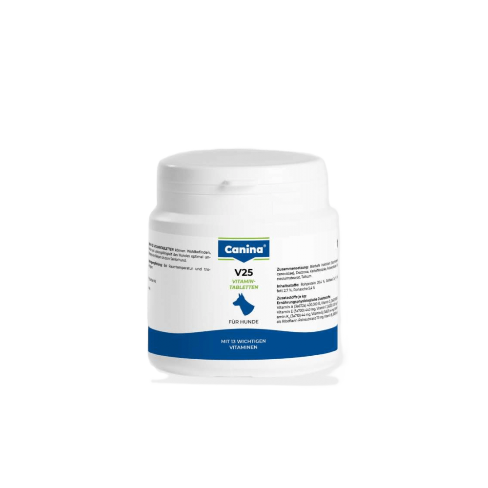 Для того, щоб забезпечити організм всіма необхідними вітамінами і доповнити раціон тварини важливими амінокислотами спеціально був розроблений продукт V25, що містить комплекс з 12 основних вітамінів і найважливіших амінокислот.Застосування:Цуценята: здоровий ріст і правильний розвиток всіх систем органів; стимулює білковий та жировий обмін, сприяє кровотворенню.Лактуючі та вагітні самки: забезпечує організм матері і щенят вітамінами та білками. Сприяє фізіологічному внутрішньоутробному розвитку плодів, зниженню стресу і виснаження організму суки.Дозування: Щодня 1 таблетка на 10 кг ваги тварини. Максимальна доза – 3 таблетки.Склад: Дріжджі, декстроза, крохмаль.Аналітичний склад:Сирий протеїн 21%, сира зола 5,6%, сирий жир 1,5%, клітковина < 0,3%.Додаткові речовини на 1 кг:Вітамін А - 440000 МE, вітамін D3 - 10000 МE, вітамін C - 1100 мг; вітамін Е - 440 мг, вітамін В1 - 44 мг, вітамін В2 - 110 мг, вітамін B6 - 44 мг; нікотинамід - 660 мг; кальцій D-пантотенат - 220 мг, вітамін К3 - 44 мг, біотин 20000 мкг, вітамін В12 – 220 мкг, фолієва кислота – 10 мг.