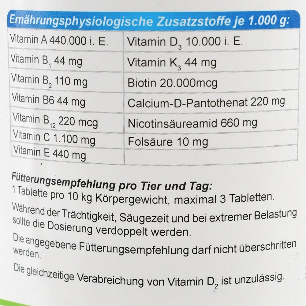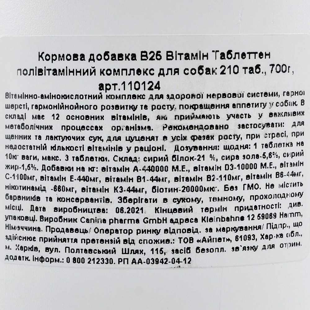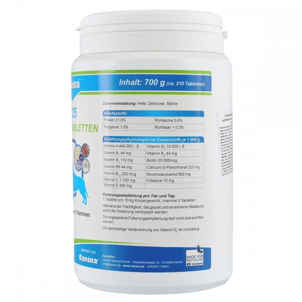 Для того, щоб забезпечити організм всіма необхідними вітамінами і доповнити раціон тварини важливими амінокислотами спеціально був розроблений продукт V25, що містить комплекс з 12 основних вітамінів і найважливіших амінокислот.Застосування:Цуценята: здоровий ріст і правильний розвиток всіх систем органів; стимулює білковий та жировий обмін, сприяє кровотворенню.Лактуючі та вагітні самки: забезпечує організм матері і щенят вітамінами та білками. Сприяє фізіологічному внутрішньоутробному розвитку плодів, зниженню стресу і виснаження організму суки.Дозування: Щодня 1 таблетка на 10 кг ваги тварини. Максимальна доза – 3 таблетки.Склад: Дріжджі, декстроза, крохмаль.Аналітичний склад:Сирий протеїн 21%, сира зола 5,6%, сирий жир 1,5%, клітковина < 0,3%.Додаткові речовини на 1 кг:Вітамін А - 440000 МE, вітамін D3 - 10000 МE, вітамін C - 1100 мг; вітамін Е - 440 мг, вітамін В1 - 44 мг, вітамін В2 - 110 мг, вітамін B6 - 44 мг; нікотинамід - 660 мг; кальцій D-пантотенат - 220 мг, вітамін К3 - 44 мг, біотин 20000 мкг, вітамін В12 – 220 мкг, фолієва кислота – 10 мг.