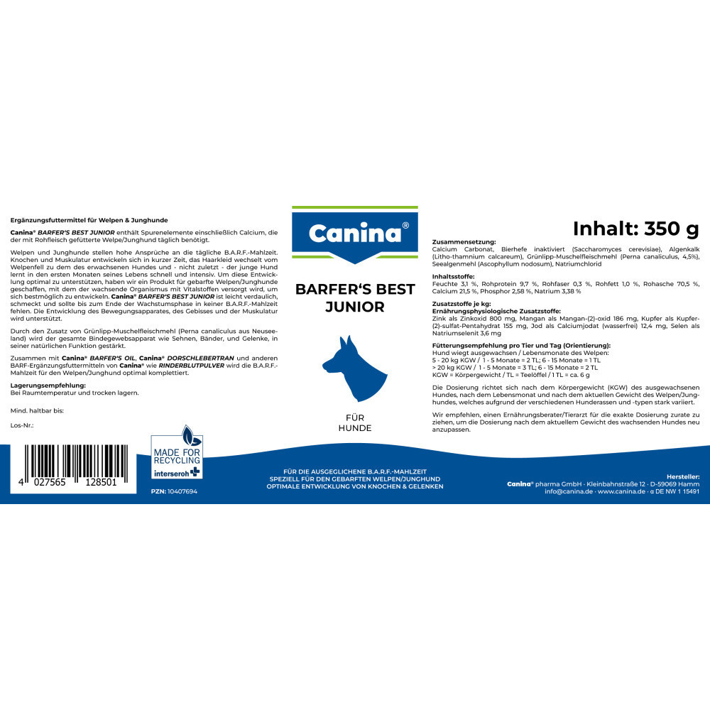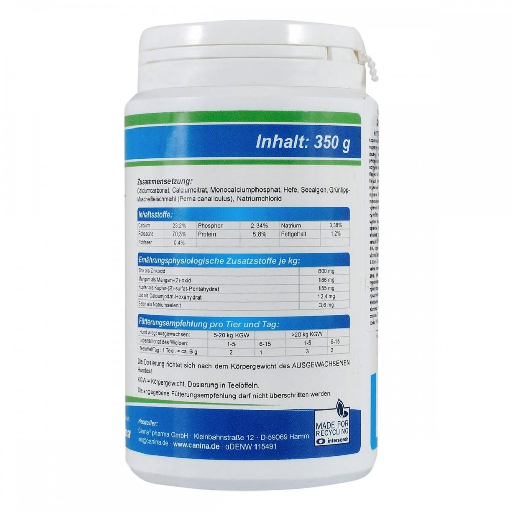 Кормова добавка для оптимальних доповнень щоденного харчування за системою BARF або з природними типами годування цуценят та молодих собак. Містить комплекс вітамінів і мінералів, щоб покрити щоденну потребу в них з урахуванням цуценя, що росте. Оскільки при годівлі м’яса тварин має баланс CA: P, продукт містить оптимально обрану кількість кальцію.Кальцій у продукті знаходиться у вигляді різних сполук, що гарантує правильний розвиток скелета, сильних зубів та нормалізує метаболічні процеси. Вітамін D3, отриманий з природних джерел, сприяє повній асиміляції кальцію з організмом, що росте.Екстракт із зелених губчастих молюсків забезпечує здоров’я, сухожилля, суглоби в цілому, а також хряща (включаючи вуха). Природні морські водорості багаті на мінерали, вітаміни, ферменти насичувати тіло безвісти в раціоні за компонентами. Дріжджі є джерелом вітамінів групи B, біотину та мінеральних сполук.Аналітична композиція: кальцій 23,2%, фосфор, 2,34%, натрій 3,38%, ясен сирий 70,3%, сирий білок 8,85, сирий жир 1,2%, жир сир. 0,4%.Вага: 350 г без ГМО. Не містить барвників та консервантів.Дозування: для цуценят 1-5 місяців.Вага 5-20 кг – 2 чайні ложки на день, для цуценят 6-15 місяців.Вага 5-20 кг – 1 чайна ложка на день, для цуценят 1-5 місяців.Вага 20 кг – 3 чайні ложки на день, для цуценят 6-15 місяців.Вага 20 кг – 2 чайні ложки на день.