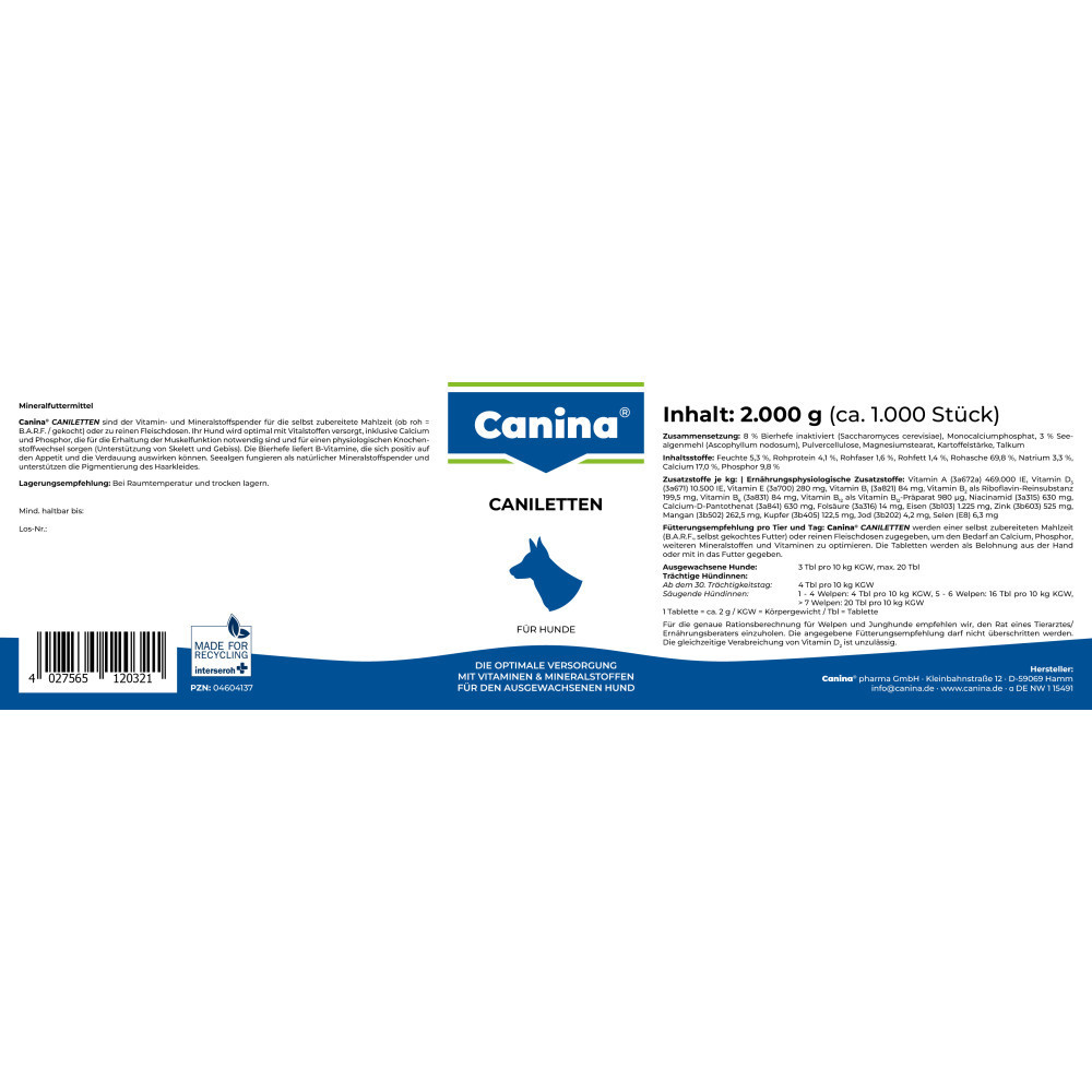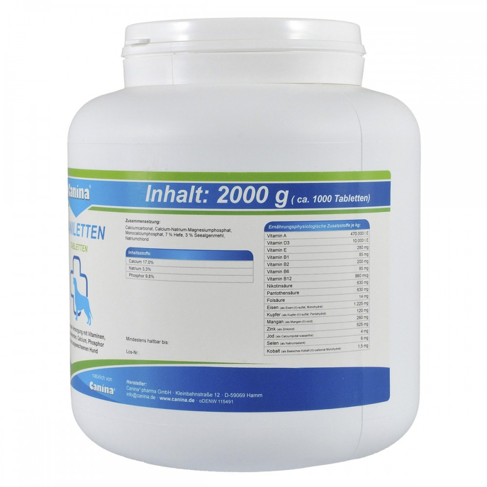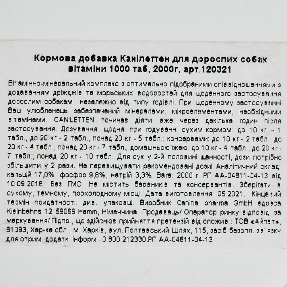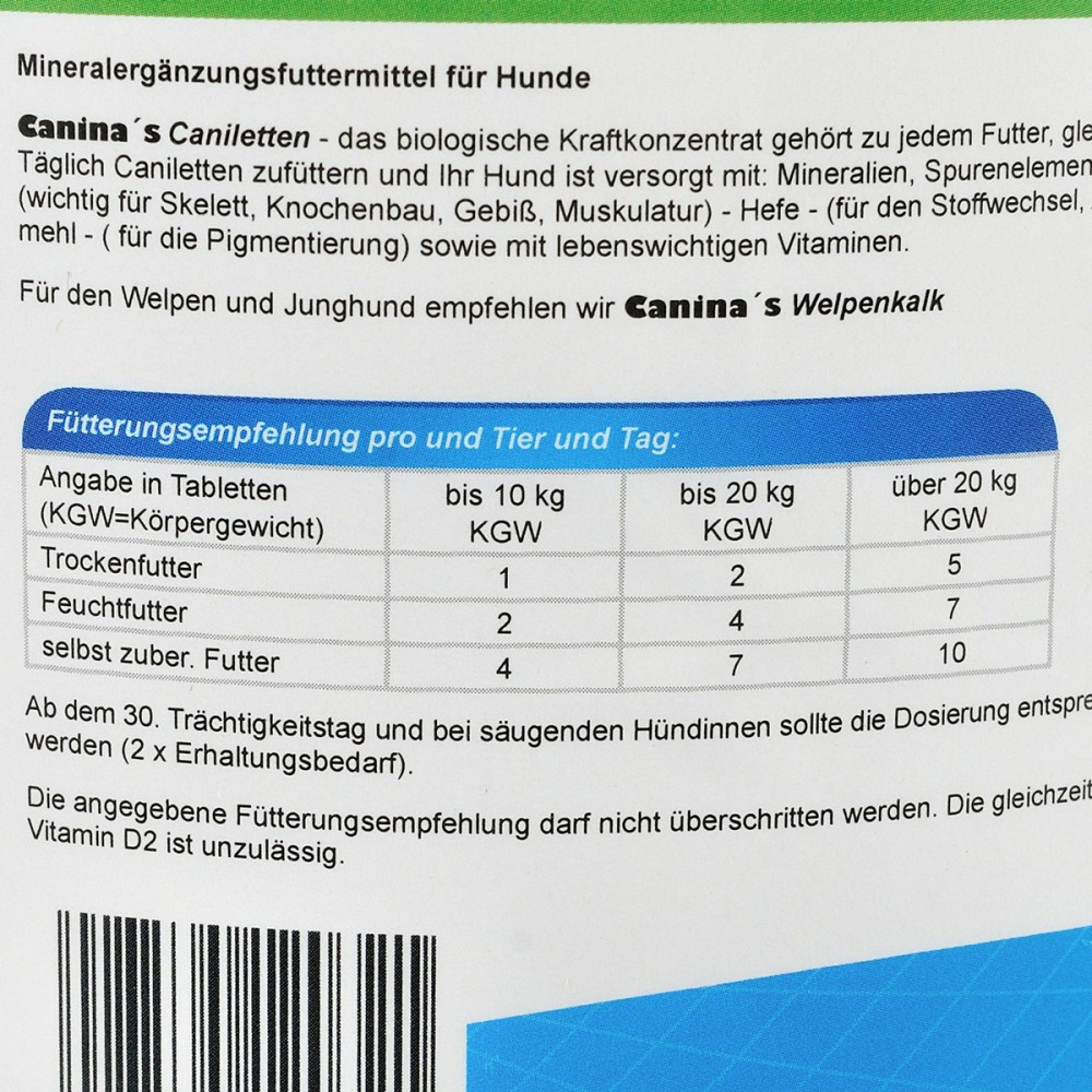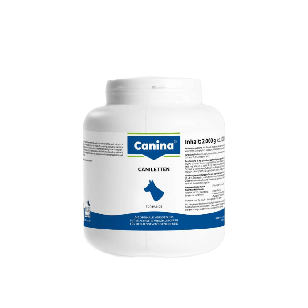 Вітамінно-мінеральний комплекс з оптимально підібраною концентрацією макро-імікроелементів, вітамінів природного походження, з додаванням дріжджів та морських водоростей для дорослих собак. Активна форма, в якій знаходиться кальцій у препараті, є легкозасвоюваною та не викликає побічних ефектів, а лише підтримує нормальну життєдіяльність організму.Дріжджі нормалізують травлення та обмін речовин, стимулюють апетит. Морські водорості (що не містять йоду) містять комплекс амінокислот, мінералів, вітамінів і сприяють нормальній, генетично закладеній пігментації шкіри, вовни та слизових оболонок. Залізо входить до складу гемоглобіну, завдяки якому здійснюється транспортування кисню. Нестача заліза може призвести до анемії.Caniletten виявляє свою ефективність: набуває максимальної концентрації в організмі вже через кілька годин після прийому.Застосування: Незалежно від типу годування.Вагітні та годуючі собаки: повноцінний розвиток плодів, попередження післяпологових ускладнень (еклампсія, остеопороз), попередження авітамінозів та анемій.Дорослі собаки: підтримання нормальної життєдіяльності організму, обміну речовин, здорової пігментації, травлення та апетиту.Дозування:до 10 кг: сухий корм – 1 табл., консерви – 2 табл., натуральна їжа – 4 табл.до 20 кг: сухий корм – 2 табл., консерви – 4 табл., натуральна їжа – 7 табл.більше 20 кг: сухий корм – 5 табл., консерви – 7 табл., натуральна їжа – 10 табл.У другій половині вагітності та на період лактації доза повинна бути подвоєна.Склад: Карбонат кальцію, фосфат кальцію-магнію натрію, монокальцій фосфат, дріжджі – 7%, морські водорості – 3%, натрію хлорид.Аналітичний склад:кальцій 17.0%, фосфор 9.8%, натрій 3.3%.Додаткові речовини на 1 кг:Вітамін А – 470000 од., фолієва кислота – 14 мг, вітамін D3 – 10000 од, залізо (як залізо 2 сульфат моногідрат) – 1,225 мг, вітамін Е – 280 мг, мідь (мідь 2 сульфат – 120 мг, вітамін В1 – 85 г, марганець (як марганець 2 оксид) – 260 мг, вітамін В2 – 200 мг, цинк(У вигляді оксиду цинку) – 525 мг, вітамін В6 – 85 г, йод (йодид кальцію зневоднений) – 4 мг, вітамін В12 – 980 мг, селен (як селеніт натрію) – 6 мг, нікотинова кислота – 630 мг, кобальт – 1.5 мг, пантотенова кислота – 630 мг.