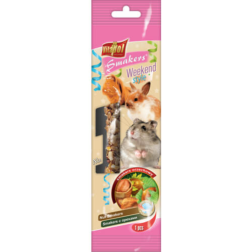 Колба Vitapol Weekend Style для гризунів, горіховий 45 г, Ласощі Smakers – ці ласощі у вигляді палички. Всі ласощі Smakers на 80% виготовляються вручну. Вони висушуються, а не запікаються, тому зберігають всі вітаміни і натуральний смак і не кришаться під час поїдання. Smakers оснащений міцним держателем, який дозволяє прикріпити ласощі до будь-якого типу клітини. Ласощі Smakers служать джерелом додаткового харчування, виготовляють зі злаків, свіжих овочів, фруктів, горіхів, ягід з додаванням меду або молока. Ласощі Smakers урізноманітнює основне меню, так як процес поїдання Smakers максимально наближений до процесу харчування тварин в природних умовах. Вага: 45 г