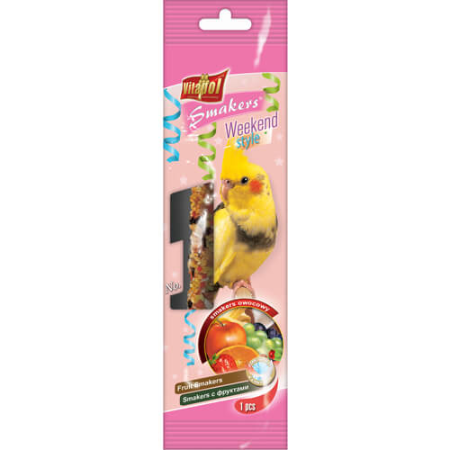 Колба Vitapol Weekend Style для німф, фруктовий, 45 г Ласощі Smakers ці ласощі у вигляді палички. Всі ласощі Smakers на 80% виготовляються вручну. Вони висушуються, а не запікаються, тому зберігають всі вітаміни і натуральний смак і не кришаться під час поїдання. Smakers оснащений міцним держателем, який дозволяє прикріпити ласощі до будь-якого типу клітини. Ласощі Smakers служать джерелом додаткового харчування, виготовляють зі злаків, свіжих овочів, фруктів, горіхів, ягід з додаванням меду або молока. Ласощі Smakers урізноманітнює основне меню, так як процес поїдання Smakers максимально наближений до процесу харчування тварин в природних умовах.