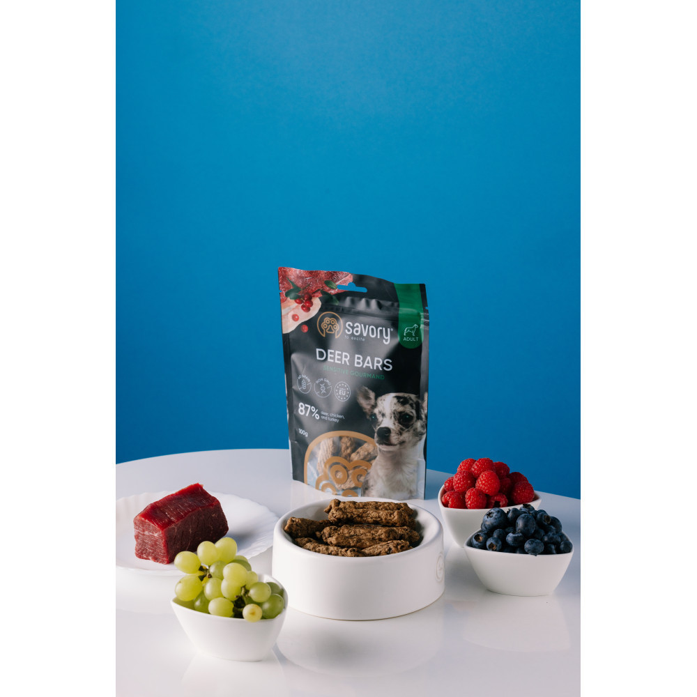 Лінійка ласощів Джерки від Savory – це нове поєднання улюблених смаків, високий вміст м’яса та щільні великі шматочки які можна смакувати ще довше. Батончики не містять зернових та інших додаткових в углеводів, що робить їх абсолютно безпечними для улюбленців які мають чутливість до глютену. Додавання корисних ягід робить смаколики Savory не лише приємним але й корисним перекусом.Джерки для дорослих собак Батончики з оленем містять 87% справжнього м’яса оленя, індички та курки, не містить ГМО, не містить зернових.Довжина одного батончика: 6-7 см.Склад:м’ясо та продукти тваринного походження індичка 37 %, оленина 26 %, курка 24 %, гліцерин рослинного походження, лігноцелюлоза, брусниця 2 %, хлорид натрію.Аналітичний склад:сирий протеїн – 33.0 %, сира клітковина – 5.0 %, жири – 24.0 %, сира зола – 9.7 %, вологість – 18.0 %.Натуральні антиоксиданти:екстракт розмарину & екстракт рослинного токоферолу (1b306(i)).Енергетична цінність:3990 ккал/кг.Рекомендації з годування:собаки до 10 кг – 1-2 штуки на день, собаки 10-15 кг – 3 штуки на день, собаки 20-25 кг – 4 штуки на день, собаки понад 30 кг – 5 штук на день.