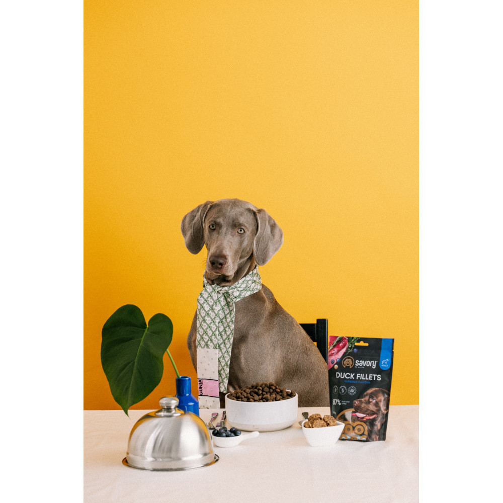 Лінійка ласощів Джерки від Savory – це нове поєднання улюблених смаків, високий вміст м’яса та щільні великі шматочки які можна смакувати ще довше. Із вуглеводів лише горохове борошно, що має низький глікемічний індекс та абсолютно безпечне для улюбленців які мають чутливість до глютену. Додавання корисних трав та ягід робить смаколики Savory не лише приємним але й корисним перекусом.Джерки для дорослих собак філе качки з індичкою містить 87% справжнього м’яса качки та індички, не містить ГМО, не містить зернових.Довжина одного філе: 6,5-7 см.Склад:м’ясо та продукти тваринного походження індичка 61 %, качка 26 %, гліцерин рослинного походження, чорниці 4 %, лігноцелюлоза, горохове борошно, чорна смородина 2 %, хлорид натрію, сухий тим’ян 0,3% , сухий розмарин 0,3%Аналітичний склад:сирий протеїн – 31.0 %, сира клітковина – 3.6 %, жири – 25.0 %, сира зола – 9.5 %, вологість – 18.0 %.Натуральні антиоксиданти:екстракт розмарину & екстракт рослинного токоферолу (1b306(i)).Енергетична цінність:4094 ккал/кг.Рекомендації з годування:собаки до 10 кг – 1-2 штуки на день, собаки 10-15 кг – 3 штуки на день, собаки 20-25 кг – 4 штуки на день, собаки понад 30 кг – 5 штук на день.
