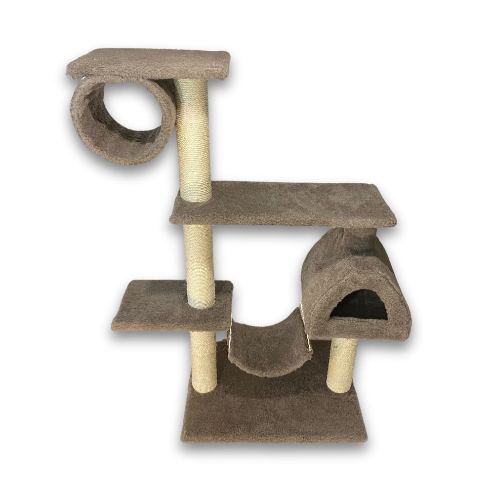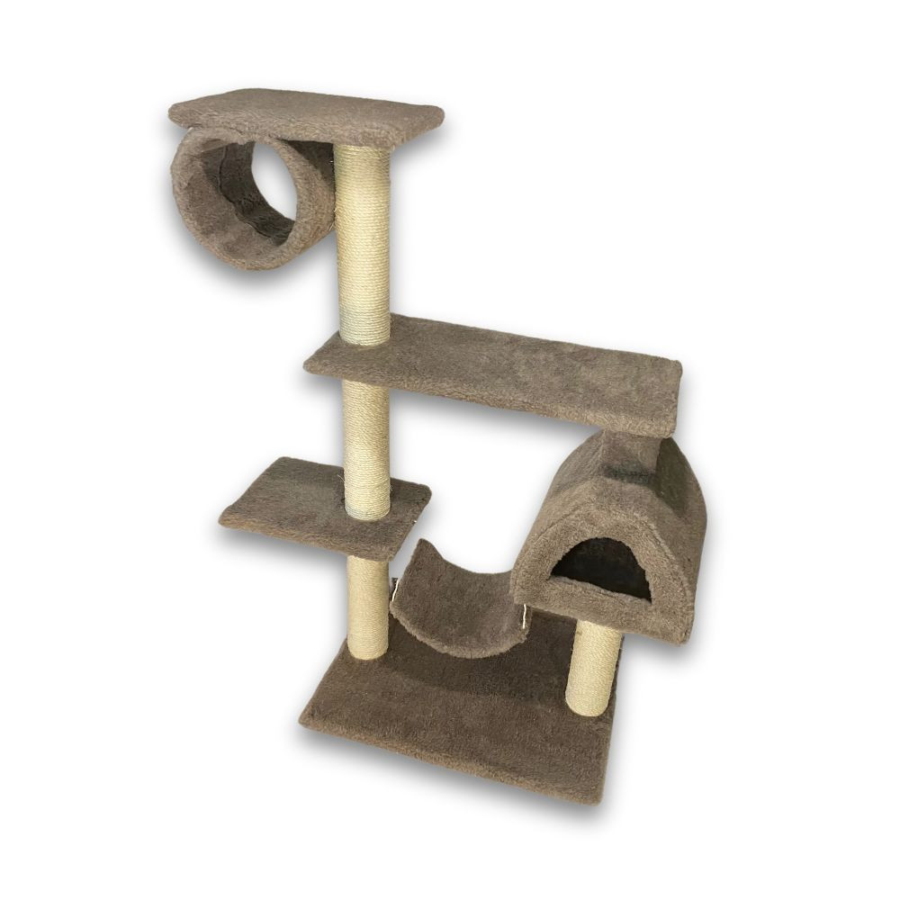 Дряпки – необхідний аксесуар в будинку, де є кішка. Сточування кігтів – природна потреба цих ласкавих вихованців, іаби задовольнити її, вони можуть використовувати меблі, стіни, двері. Але такий варіант зазвичай не влаштовує господарів, тому спеціальна дряпка дозволить вирішити відразу два завдання:задовольнити бажання кішки поточити кігтізберегти цілими меблі, стіни, килими та інші предмети.Дряпка «Містечко» завдяки унікальній конструкції компактно розміщується в будь-якому місці кімнати. Завдяки оригінальному дизайну вона стане милою прикрасою інтер’єру, додасть оселі особливий затишок. Енергійні улюбленці, особливо кошенята, будуть в захваті від цієї моделі, що надає прекрасну можливість попустувати, пограти і відпочити з комфортом.На підставці, оббитій якісним штучним хутром, встановлені два стовпчики-дряпки з обмоткою з сизалевого джгута. На стовпчиках закріплені всі інші яруси конструкції.Перший ярус – затишний будиночок з одного боку і майданчик для ігор і відпочинку з іншого, між якими на міцних шнурах підвішений зручний гамачок зі штучного хутра. Другий ярус складається з просторої полиці, а третій – з невеликої підставки з прикріпленим до неї барабаном, оббитим штучним хутром. Тут воркотик зможе і пограти, і відпочити.Естетичність, надійність, довговічність і турбота про дозвілля вашого вихованця – ось основні принципи, якими керувалися творці моделі. Порадуйте свого котика розкішним місцем для розваг і відпочинку.Розмір основи:108х49 смВисота:122 смМатеріал:ДСП, штучне хутро, сизаль