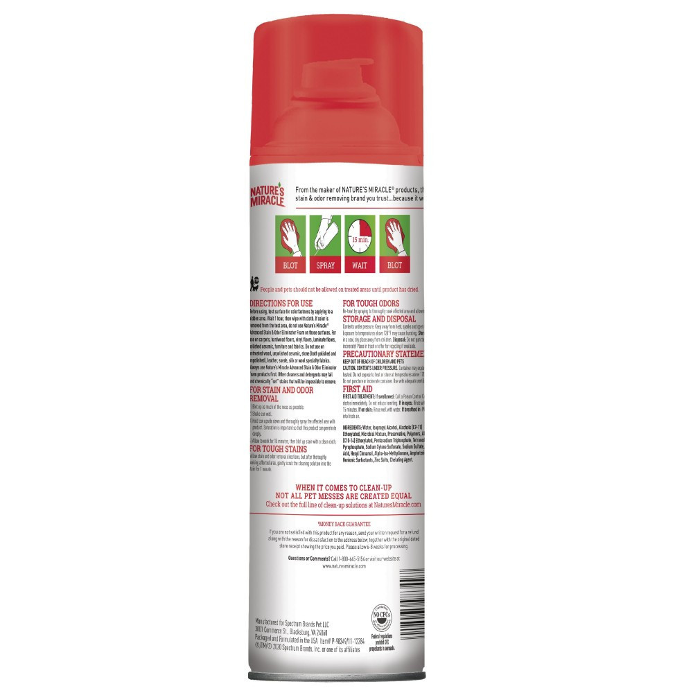 Знищувач плям і запахів від сечі котів в формі аерозоль-піни від Nature’s Miracle розроблена для видалення плям і запахів від сечі, які важко вивести. Засіб працює на килимах, пледах, меблях, тканинах та інших поверхнях. Піна проникає глибоко в ворс поверхні, щоб ефективно видалити навіть ті плями і запахи, що в’їлися.Інструкція із застосування:Використовуйте засіб для чищення килимів, підлоги, меблів, одягу, кліток, туалетів, спальних місць тварин та інших поверхонь. Не наносьте піну на шкіряні, замшеві, шовкові і шерстяні вироби.Перед використанням:протестуйте поверхню на стійкість кольору на непомітній ділянці;використовуйте у початковій концентрації, не розводити;завжди застосовуйте засіб першим, засоби для виведення плям інших виробників можуть хімічно зафіксувати пляму, і її буде неможливо видалити;перед застосуванням добре струснути.Для видалення плям і усунення запахів видаліть залишки рідини та бруд, рясно нанесіть засіб на забруднену поверхню, почекайте 15 хвилин і витріть серветкою.Для видалення запахів піна повинна проникнути на всю глибину джерела запаху, тому просочіть ВСІ шари тканини, оббивки меблів і обробіть місце під килимами. Не підпускайте тварин до обробленої ділянки до її повного висихання.Для повного усунення запаху на меблях і килимах може знадобитися до 2-х тижнів. Для плям, що важко вивести, використовуйте жорстку щітку і залиште піну на 24 години.Склад: деіонізована вода, неіонний етоксілат спирту, триполіфосфат натрію, сульфат натрію ксилолу, лимонна кислота, безводний ізопропіловий спирт 99%, суміш бактеріальних спор, поглинач запахів Flexisorb OD-100, ароматизатор.