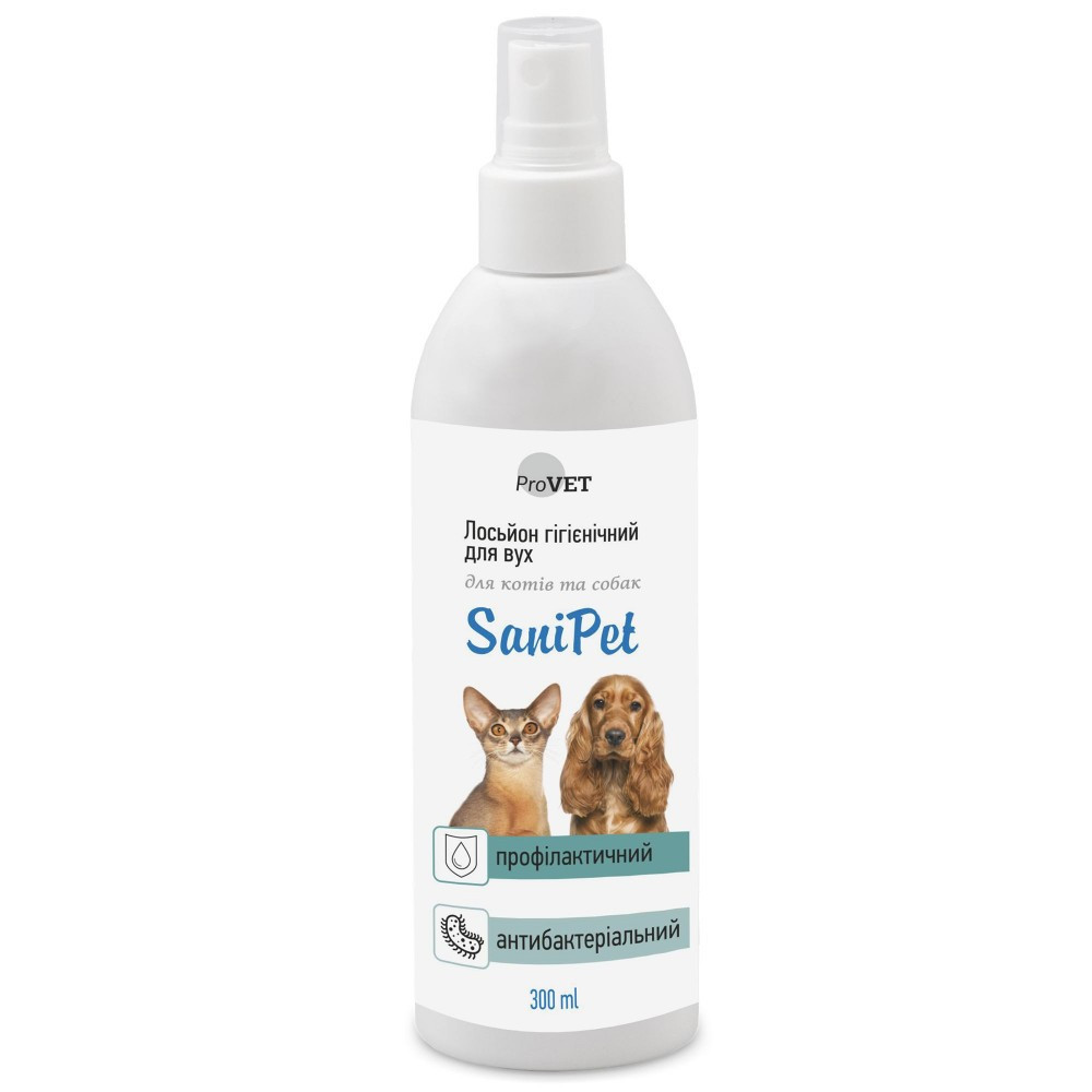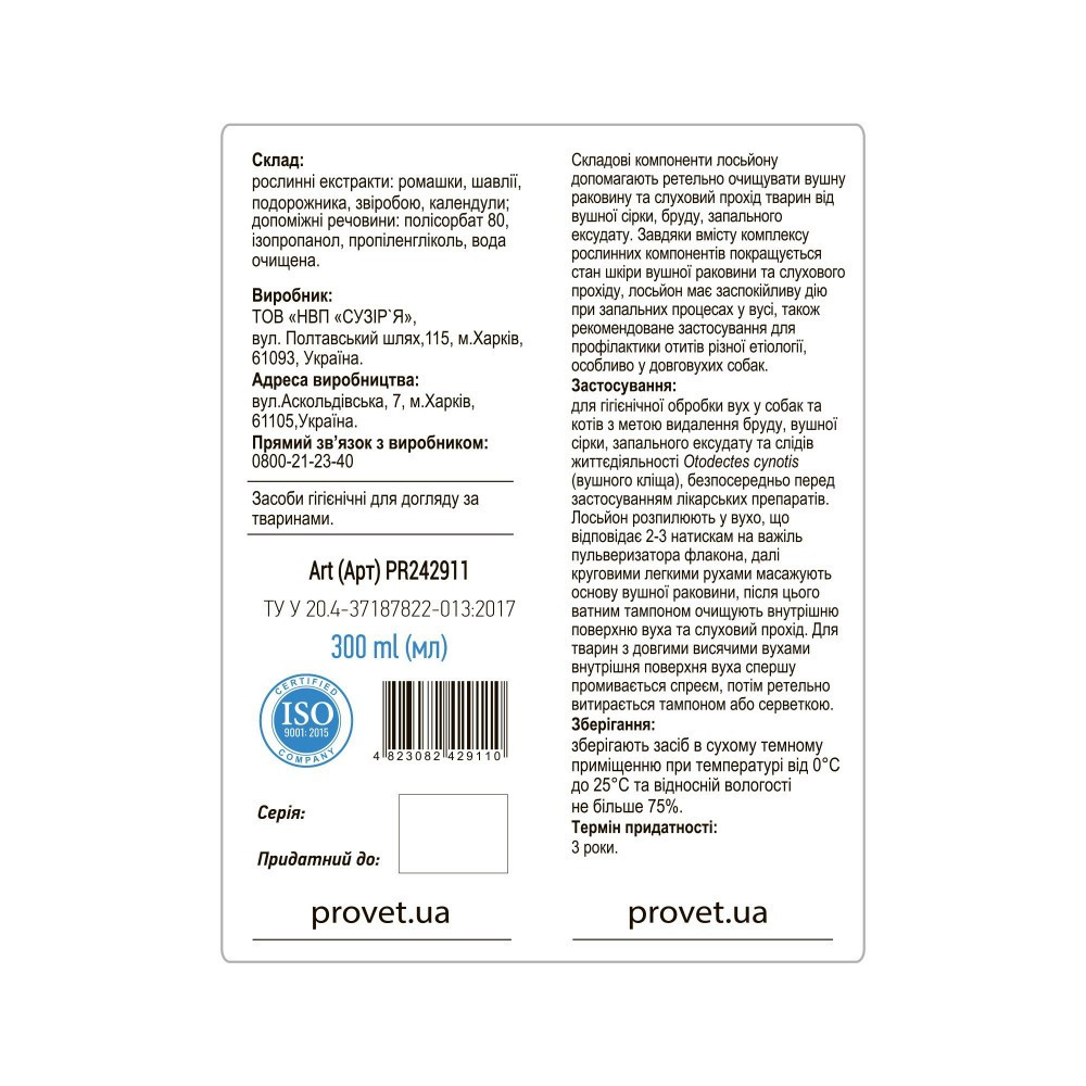 Складові компоненти лосьйону допомагають ретельно очищувати вушну раковину та слуховий прохід тварин від вушної сірки, бруду, запального ексудату. Завдяки вмісту комплексу рослинних компонентів покращується стан шкіри вушної раковини та слухового прохіду, лосьйон має заспокійливу дію при запальних процесах у вусі, також рекомендоване застосування для профілактики отитів різної етіології, особливо у довговухих собак.Переваги:покращується стан шкіри вушної раковини та слухового проходу;має заспокійливу дію;профілактики отитів різної етіології.Спосіб застосування:для гігієнічної обробки вух у собак та котів з метою видалення бруду, вушної сірки, запального ексудату та слідів життєдіяльності Otodectes cynotis (вушного кліща), безпосередньо перед застосуванням лікарських препаратів. Лосьйон розпилюють у вухо, що відповідає 2-3 натискам на важіль пульверизатора флакона, далі круговими легкими рухами масажують основу вушної раковини, після цього ватним тампоном очищують внутрішню поверхню вуха та слуховий прохід. Для тварин з довгими висячими вухами внутрішня поверхня вуха спершу промивається спреєм, потім ретельно витирається тампоном або серветкою.Умови зберігання:зберігають засіб в сухому темному приміщенню при температурі від 0°C до 25°C та відносній вологості не більше 75%.Склад: рослинні екстракти: ромашки, шавлії, подорожника, звіробою, календули; допоміжні речовини: полісорбат 80, ізопропанол, пропіленгліколь, вода очищена.Термін придатності:3 роки.Об’єм: 300 мл.Технічні умови (ТУ):ТУ У 20.4-37187822-013:2017. Сертифікат: ISO 9001:2015