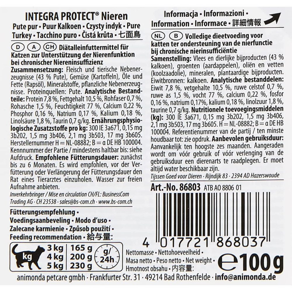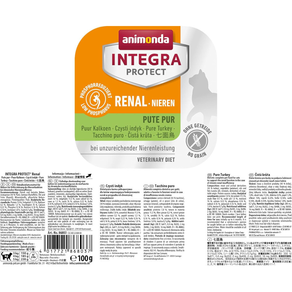 INTEGRA PROTECT Renal з індичкою – спеціальний дієтичний корм суперпреміум класу для котів із захворюваннями нирок. Цей раціон містить значно менше фосфору і білка в порівнянні зі звичайним кормомТаким чином, INTEGRA PROTECT Renal може стримати прогресування захворювання та покращити стан улюбленця. Хоча коти із захворюваннями нирок часто мають поганий апетит, цей корм дуже привабливий на смак навіть для перебірливих і хворих вихованців.При хронічній нирковій недостатностіЗнижений фосфорЗнижений білокБез зернаВідмінне прийняттяЕнергетична цінність на 100 г у МДж:0,53Склад:м’ясо та субпродукти тваринного походження (43% індички), овочі (картопля), олії та жири (ріпакова олія), мінерали, рослинні субпродукти.Аналітичний склад:білок 7,8%, вміст жиру 11,5%, сира клітковина 0,5%, сира зола 1,3%, вологість 76%, кальцій 0,22%, фосфор 0,16%, натрій 0,16%, калій 0,16%, лінолева кислота 1,8%, таурин 0,7 г/кг.Харчові добавки:180 МО вітаміну D3, 0,4 мг йодату кальцію, 2 мг амінокислоти міді, 2 мг моногідрату сульфату марганцю, 16 мг моногідрату сульфату цинку.Рекомендації щодо годування (наступні вказівки служать орієнтиром):Якщо кіт важить 3 кг, він може отримувати 150 г в день;при вазі 4 кг – 185 г;котові вагою 5 кг можна запропонувати 230 г.Розраховуючи оптимальну порцію для котів, завжди варто враховувати вік, вагу і темперамент улюбленця.