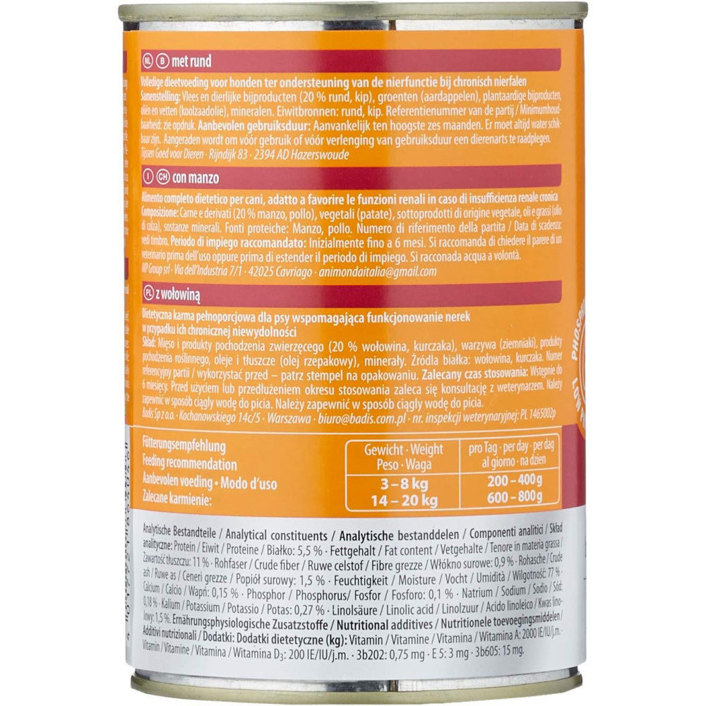 INTEGRA PROTECT Renal з яловичиною – спеціальний дієтичний корм суперпреміум класу для собак із хронічною нирковою недостатністю. Цей дієтичний раціон розроблено відповідно до особливих харчових потреб собак із захворюваннями нирок. Він містить менше фосфору, ніж звичайні корми. Це уповільнює прогресування захворювання.Знижений вміст білка може значно поліпшити самопочуття собаки. У той же час цей корм забезпечує всі інші поживні речовини, які щодня потрібні хворому чотирилапому. Таким чином, INTEGRA PROTECT Renal з яловичиною може сприяти подовженню тривалості життя.При хронічній нирковій недостатностіЗнижений фосфорЗнижений білокБез зернаВідмінне прийняттяСклад:м’ясо та субпродукти тваринного походження (15,5% яловичина, курка), овочі (картопля), олії та жири, рослинні субпродукти, мінеральні речовини.Аналітичний склад:білок 5,5%, вміст жиру 9,8%, сира клітковина 1%, сира зола 2%, волога 76%, кальцій 0,2%, фосфор 0,1%, натрій 0,09%, калій 0,17%, лінолева кислота 2%Харчові добавки:200 МО вітаміну D3, 0,75 мг йодату кальцію, 1,5 мг пентагідрату сульфату міді (II), 1,4 мг моногідрату сульфату марганцю, 25 мг сульфату цинку моногідрату.Енергетична цінність на 100 г у МДж:0,51Рекомендації щодо годування (наступні вказівки служать орієнтиром):собаці вагою 3 кг – 200 г;собаці вагою 9 кг варто запропонувати 400 г;собака вагою 14 кг має отримувати 600 г.При розрахунку ідеальної кількості їжі для собак завжди слід враховувати вік, вагу і темперамент улюбленця.