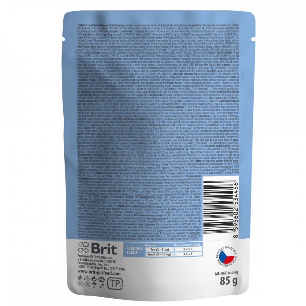 Делікатес для наших маленьких «великих» улюбленців, які іноді можуть бути дуже вибагливими. Або їм часто хочеться поласувати. Щоб песику було ще смачніше, а в животику – справжнє свято, запропонуйте своєму чотирилапому шматочки м’ясного філе в делікатесному соусі.Це комплексний суперпреміум корм для собак мініатюрних порід, який є ідеальним доповненням до сухого корму.Особливості корму:Збагачений пребіотиками для нормалізації процесів травленняЗ травами та суперфудами – природніми джерелами вітамінів й антиоксидантівМаксимально підходить для вибагливих собакМає високі смакові якостіСклад: 85 % м’яса та продуктів тваринного походження у філе (8 % оленини), 2,7 % горохового борошна, 0,5 % сушеної лохини, 0,7 % лігноцелюлози, 0,4 % сушеної гвоздики, 0,4 % сушених цитрусових, 0,4 % сушеного розмарину, 0,4 % сушеної куркуми, 0,2 % карбонату кальцію.Аналітичний склад:сирий білок 6 %, вміст жиру 4 %, сира зола 1 %, сира клітковина 0,4 %, волога 84 %, кальцій 0,3 %, фосфор 0,2 %, натрій 0,2 %.Харчові добавки на 1 кг:вітамін А (3a672a) 300 МО, вітамін D3 (3a671) 65 МО, вітамін Е (3a700) 35 мг, біотин (3a880) 0,1 мг, цинк (3b606) 3 мг, залізо (3b106) , марганцю (3b504) 0,7 мг, йоду (3b201) 0,2 мг, міді (3b406) 1 мг, таурину (3a370) 240 мг.Енергетична цінність:774 ккал/кг.Рекомендації з годування:рекомендовану щоденну кількість корму, вказану в таблиці, варто розподілити на декілька прийомів протягом дня. Якщо корм подається в якості доповнення до сухого корму, то варто зменшити дозування. У собаки завжди повинен бути доступ до джерела свіжої питної води. Годуйте кормом кімнатної температури. Після відкриття зберігайте у холодильнику.Вага собаки (кг)2345678910Добова норма (г)170212255297340382425467510