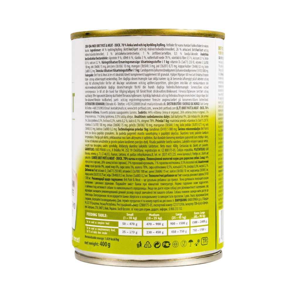 Повноцінний вологий корм суперпреміум класу для дорослих собак.Особливості Brit Paté & Meat:70% м’ясаВишукана комбінація м’яса зі шматочками потрушків у апетитному паштетіДелікатне приготування – це гарантія відмінного смаку й аромату, який ласуватиме навіть найвибагливішим чотирилапим гурманам.Ідеальне доповнення до сухого корму. Урізноманітнює раціон і доповнює його рідиною.Без зернових, без сої, без ГМОЕнергетична цінність:1 029 ккал/кгСклад:44% курка (м’ясо та субпродукти), 26% качка (м’ясо та субпродукти), 3% горохового крохмалю, 1% горохового волокна , 0,5% лососеве масло.Аналітичні компоненти:сирий протеїн 9 %, вміст жиру 6 %, сира зола 3 %, волога 78 %, сира клітковина 0,5%, кальцій 0,1 %, фосфор 0,3 %, натрій 0,2 %.Харчові добавки на 1 кг:вітамін D3 (3a671) 250 МО, вітамін E (3a700) 100 мг, цинк (3b606) 15 мг, залізо (3b106) 10 мг, марганець (3b504) 3 мг, йодид калію (3b201) 0,75 мг, мідь (3b406) 0,5 мг, біотин (3a880) 0,2 мг. Технічні добавки на 1 кг: камедь ріжкового дерева (E410) 5 000 мг.Вага собаки (кг)1-1010-2525-4545-90Добова норма (г)100-200200-400400-800800-1200