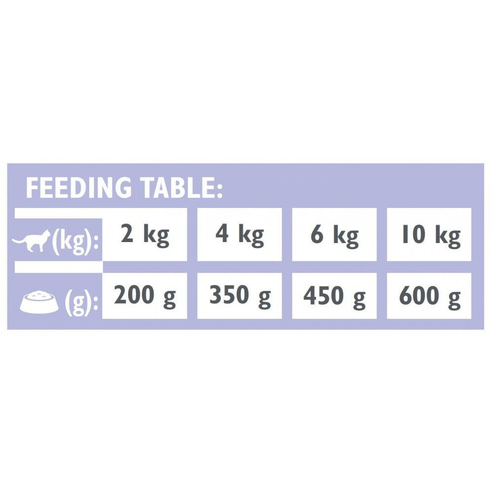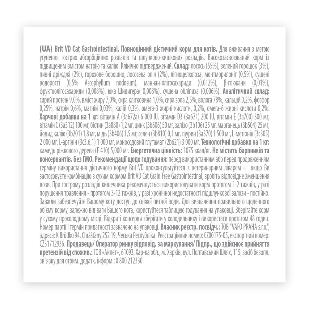 Повнораціонний та збалансований дієтичний корм для котів, які страждають шлунково-кишковими розладами.Показання:Нутритивна підтримка гострого гастроентеритуНутритивна підтримка хронічного гастроентеритуДієта підходить для випадків мальабсорбції і низької перистальтики товстої кишкиПокращує якість випорожнень і зменшує прояви метеоризмуРекомендації з годування:перед використанням або перед продовженням терміну використання дієтичного корму Brit VD проконсультуйтеся з ветеринарним лікарем – якщо Ви застосовуєте комбінацію з сухим кормом Brit VD Cat Grain Free Gastrointestinal, зробіть відповідне зменшення дози. При гострому розладів кишечника рекомендується використовувати корм протягом 1-2 тижнів, у разі порушення травлення – протягом 3-12 тижнів, у разі хронічної недостатності підшлункової залози – постійно. Завжди забезпечуйте Вашому коту доступ до свіжої питної води. Для визначення правильного щоденного об’єму корму, залежно від ваги Вашого кота, користуйтеся таблицею годування на упаковці. Зберігайте корм у сухому прохолодному місці. Відкриті консерви зберігати у холодильнику і використати протягом 48 годин.Склад:лосось (55%), зелений горошок (3%), пивні дріжджі (2%), горохове борошно, лососева олія (2%), лігноцелюлоза, монтморилоніт (0,5%), сушені водорості (0,5% Ascophyllum nodosum), маннанолігосахариди (0,012%), β-глюкани (0,01%), фруктоолігосахариди (0,008%), юка Шидігера(0,008%), сушена обліпиха (0,006%).Аналітичний склад:сирий протеїн 9,0%, вміст жиру 7,0%, сира клітковина 1,0%, сира зола 2,5%, волога 78%, кальцій 0,2%, фосфор 0,25%, натрій 0,6%, магній 0,03%, калій 0,3%, омега-3 жирні кислоти, 0,2%, омега-6 жирні кислоти 0,2%.Харчові добавки на 1 кг:вітамін A (3a672a) 6 000 IU, вітамін D3 (3а671) 200 IU, вітамін E (3a700) 300 мг, вітамін C (3a312) 100 мг, біотин (3a880) 1,2 мг, цинк (3b606) 50 мг, залізо (3b106) 25 мг, марганець (3b504) 25 мг, йодид калію (3b201) 1,8 мг, мідь (3b406) 1,5 мг, селен (3b810) 0,1 мг, таурин (3a370) 1 500 мг, L-метіонін (3c305) 2 000 мг, L-аргінін (3c3.6.1) 1 000 мг, моносодовий глутамат (2b621) 3 000 мг. Технологічні добавки на 1 кг: камедь ріжкового дерева (Е 410) 5,000 мг.Енергетична цінність:1075 ккал/кг.Вага котаДобова норма2 кг200 г4 кг350 г6 кг450 г10 кг600 г