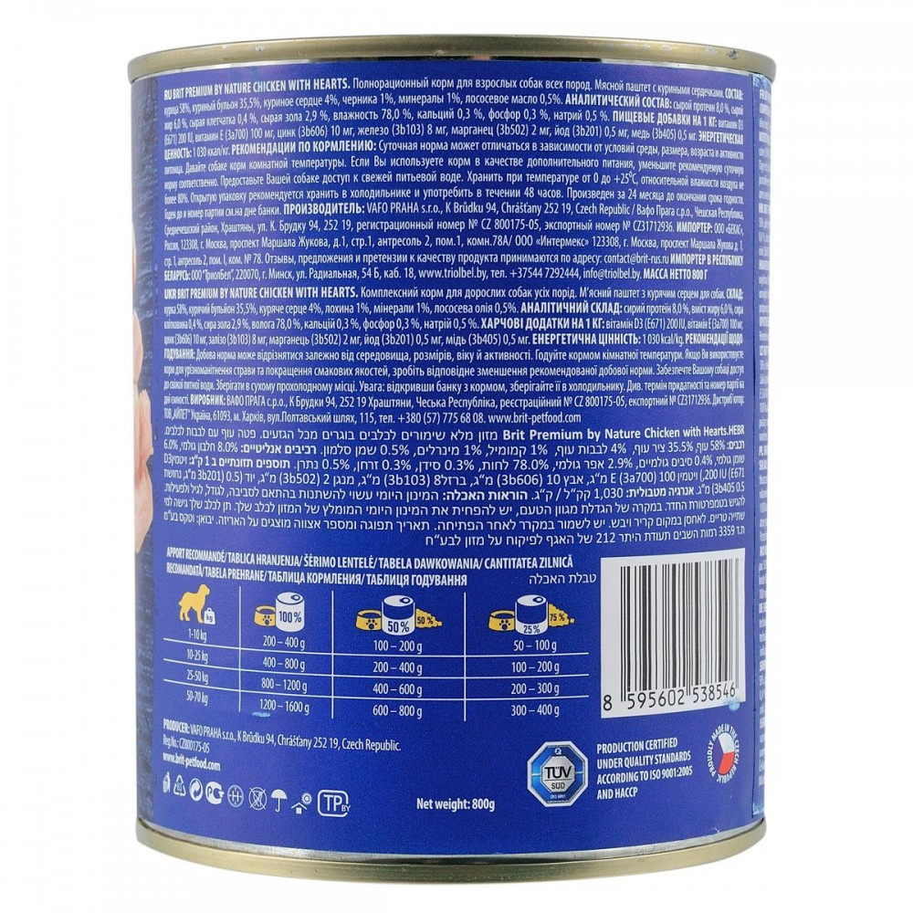 Повноцінний вологий корм преміумкласу для собак. Смачний м’ясний паштет, збагачений лохиною для підтримки імунітету,олією лосося – природним джерелом жирних кислот Омега-3, фруктами та травами.Переваги вологого корму для собак Brit Premium by Nature:Відмінна засвоюваність і прекрасний смакЗбалансована кількість поживних речовин, вітамінів і мінералівБез зернових, без солі, без ГМОСклад:курка 58%, курячий бульйон 35,5%, куряче серце 4%, лохина 1%, мінерали 1%, лососеве масло 0,5%.Аналітичні компоненти: сирий протеїн 8,0 %, вміст жиру 6,0 %, сира клітковина 0,4 %, сира зола 2,9 %, волога 78,0 %, кальцій 0,3 %, фосфор 0,3 %, натрій 0,5 %.Харчові добавки на 1 кг:вітамін D3 (E671) 200 МО, вітамін E (3a700) 100 мг, цинк (3b606) 10 мг, залізо (3b103) 8 мг, марганець (3b502) 2 мг, йод (3b201) 0,5 мг, мідь (3b405) 0,5 мг.Енергетична цінність:1 030 ккал/кг.Вага собаки (кг)1-1010-2525-5050-70Добова норма (г/день)200-400400-800800-12001200-1600