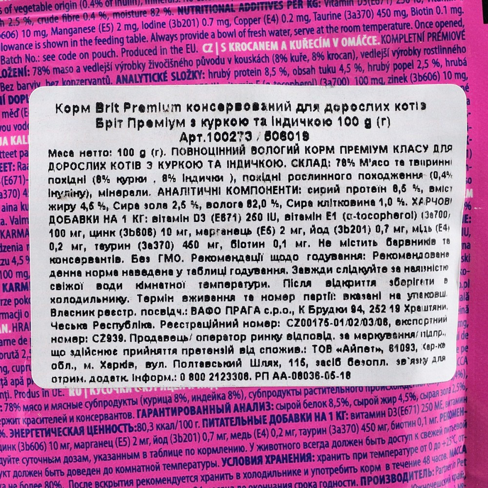Повноцінний вологий корм преміумкласу для дорослих котів, з куркою та індичкою.Запах м’ясця приваблює котика, а в якості нагороди за смачнючу їжу ви отримаєте задоволене мурчання від улюбленця, адже ніжний смак і звабливий аромат цього корму оцінить кожен кіт-гурман.Переваги вологого корму Brit Premium Cat pouch:Високий вміст м’ясаДелікатний метод приготування на пару зберігає оригінальний смак і неповторний аромат м’ясаЗ вітамінами та мінераламиБез штучних ароматів та без консервантівСклад: 85% м’яса та продуктів тваринного походження в шматочках (40% курки, 12% індички), похідні рослинного походження (0,4% інуліну), мінерали. Без ГМО.Аналітичні компоненти: сирий протеїн 8,5%, вміст жиру 4,5%, сира зола 2,5%, сира клітковина 0,4%, вологість 82,0%.Добавки на 1 кг(kg):вітамін D3 (3a671) 160 МО, вітамін Е (3a700) 100 мг(mg), цинк (3b605) 10 мг(mg), марганець (3b502) 2 мг(mg), йод (3b202) 0,2 мг(mg), мідь (3b405) 1,2 мг(mg), таурин (3a370) 520 мг(mg), біотин 0,1 мг(mg).Енергетична цінність: 80 ккал/кг(kсal/kg).Вага кота (кг)2468Добова норма (паучів/день)1,5345