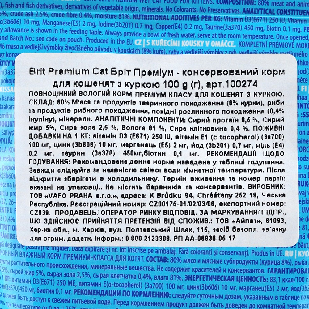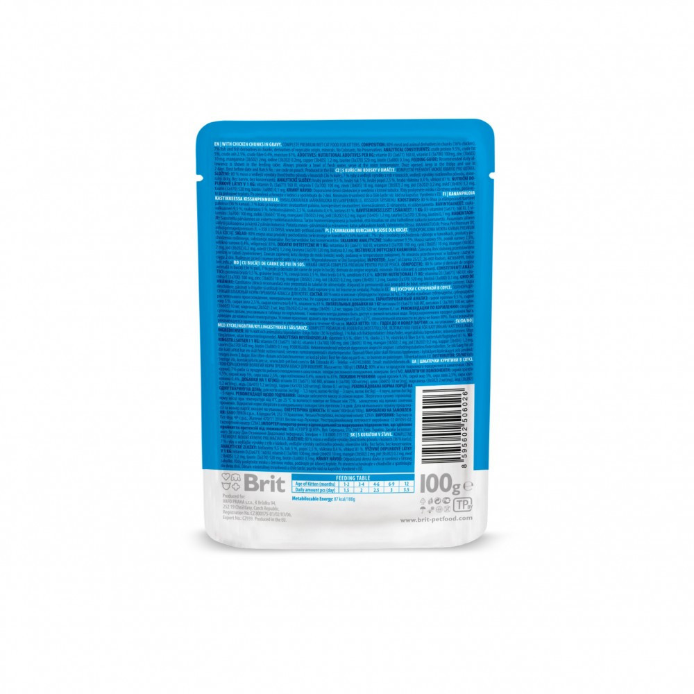 Повноцінний вологий корм преміум класу для кошенят, з куркою.Запах м’ясця приваблює котика, а в якості нагороди за смачнючу їжу ви отримаєте задоволене мурчання від улюбленця, адже ніжний смак і звабливий аромат цього корму оцінить кожен кіт-гурман.Переваги вологого корму Brit Premium Cat pouch:Високий вміст м’ясаДелікатний метод приготування на пару зберігає оригінальний смак і неповторний аромат м’ясаЗ вітамінами та мінераламиБез штучних ароматів та без консервантівСклад: 80% м’яса та продуктів тваринного походження в шматочках (36% курки), 7% риби та продуктів рибного походження в шматочках, похідні рослинного походження, мінерали. Без ГМО.Аналітичні компоненти:сирий протеїн 9,5%, сирий жир 5%, сира зола 2,5%, сира клітковина 0,4%, вологість 81%.Добавки на 1 кг(kg):вітамін D3 (3a671) 160 МО, вітамін Е (3a700) 100 мг(mg), цинк (3b605) 10 мг(mg), марганець (3b502) 2 мг(mg), йод (3b202) 0,2 мг(mg), мідь (3b405) 1,2 мг(mg), таурин (3a370) 520 мг(mg), біотин 0,1 мг(mg).Енергетична цінність:87 ккал/кг(kсal/kg).Вік кошеняти (місяці)1-23-44-66-912Добова норма (паучів/день)1,522,533,5