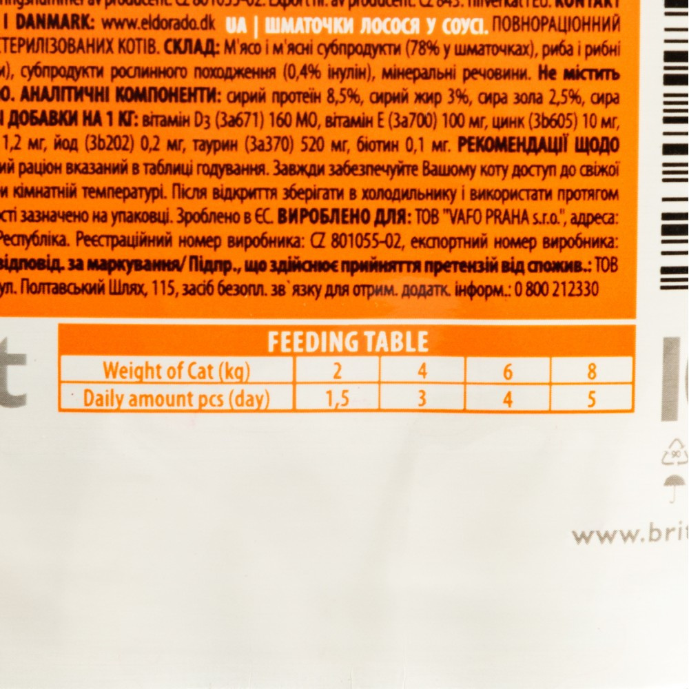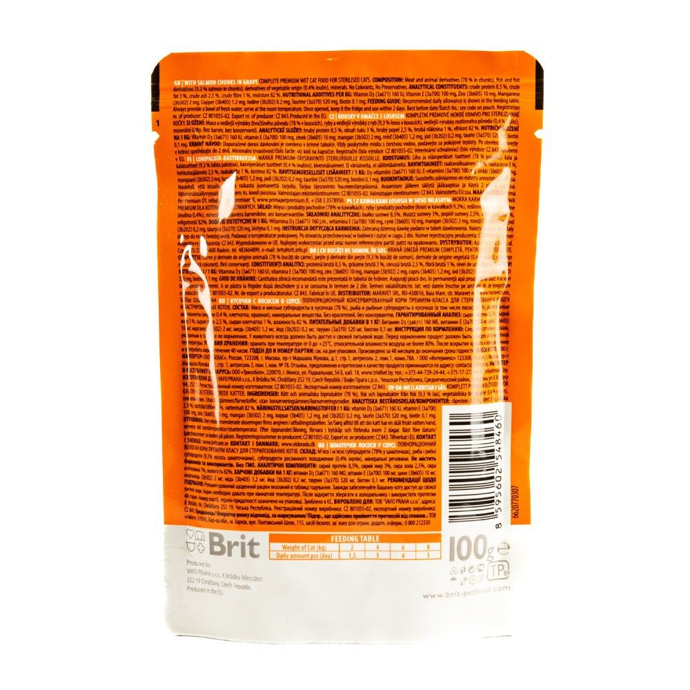 Brit Premium Cat Pouch шматочки лосося у соусі – це повнораціонний вологий корм преміумкласу, створений спеціально для задоволення усіх харчових потреб стерилізованих котів. Цей продукт відмінно враховує природні уподобання стерилізованих улюбленців та відповідає їхнім спеціальним харчовим потребам.Основні переваги:Смачний соус. Ніжний соус ідеально підкреслює смак м’ясних шматочків, створюючи справжню гастрономічну насолоду для вашого улюбленця.Повноцінний склад. Містить високоякісне м’ясо і м’ясні субпродукти (78%)Відповідає харчовим потребам улюбленців. Раціони Brit Premium розроблені з урахуванням природних потреб котів різного віку, а також тих, які потребують спеціального харчування.Brit Premium Cat Pouch – це гарантія збалансованого харчування та задоволення смакових пристрастей вашого котика.Склад: м’ясо і м’ясні субпродукти (78% у шматочках), риба і рибні субпродукти (9,3% лосось шматочками), субпродукти рослинного походження (0,4% інулін), мінеральні речовини. Не містить барвників та консервантів. Без ГМО.Аналітичні компоненти:сирий протеїн 8,5%, сирий жир 3%, сира зола 2,5%, сира клітковина 1%, вологість 82%.Поживний склад:вітамін D3 (3a671) 160 МО, вітамін E (3a700) 100 мг, цинк (3b605) 10 мг, марганець (3b502) 2 мг, мідь (3b405) 1,2 мг, йод (3b202) 0,2 мг, таурин (3a370) 520 мг, біотин 0,1 мг.