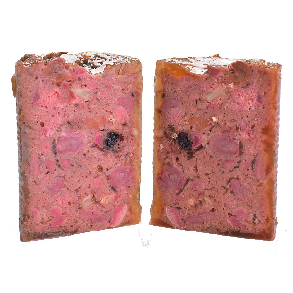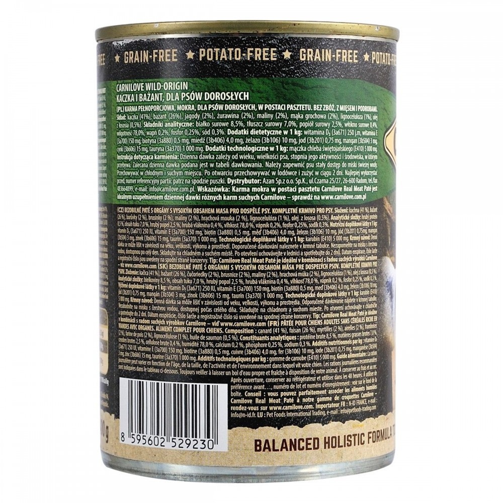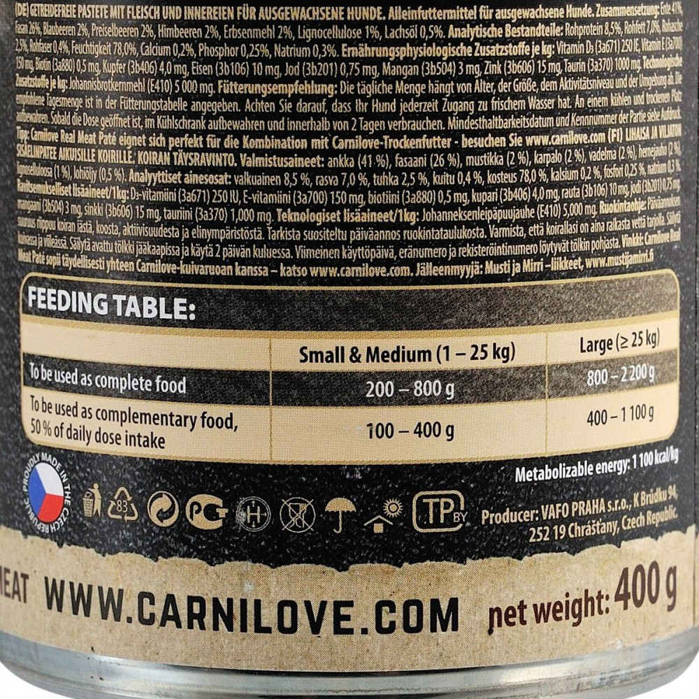 Паштет, що не містить злакових з високою долею м’яса для дорослих собак. Повноцінний корм для собак.Качка— це ідеальне джерело білків з високим вмістом поліненасичених жирних кислот (ПНЖК), які знижують рівень холестерину в крові. М’ясо качки — це фантастичне джерело ніацину (вітаміну В3), який відіграє важливу роль у процесах обміну речовин в організмі, а також допомагає знизити рівень холестерину в крові.Качкамістить вітаміни А і С, а також важливі мінерали, такі як залізо, кальцій і селен, тоді як фазан є чудовим джерелом вітаміну В12, фосфору і селену. Поєднання м’яса качки і фазана дозволило створити дієтично збалансований і поживний продукт, що містить всі незамінні амінокислоти.Склад:качка (41%), фазан (26%), чорниця (2%), журавлина (2%), малина (2%), горохова борошно (2%), лігноцелюлоза (1%), лососевий жир (0,5%)Харчові добавки на 1 кг:вітамін D3 (3a671) 250 MO, вітамін E (3a700) 150 мг, біотин (3a880) 0,5 мг мідь (3b406) 4 мг, залізо (3b106) 10 мг, йод (3b201) 0,75 мг магній (3b504) 3 мг, цинк (3b606) 15 мг, таурин (3a370) 1 000 мг. “”Технологічні добавки на 1 кг: камедь ріжкового дерева (E410)”” 5 000 мг.Аналітичний склад на 1 кг:сирий білок 8,5 %, вміст жиру 7 %, волога 78 %, сира зола 2,5 %, сира клітковина 0,4 %, кальцій 0,2 %, фосфор 0,25 %, натрій 0,3 %.Енергетична цінність:1210 kcal/kgВага собаки (кг)Добова норма (г/день)Тільки вологийкормКомбіноване годування(сухий+вологий)1-25 кг200-800100-400понад 25 кг800-2200400-1100
