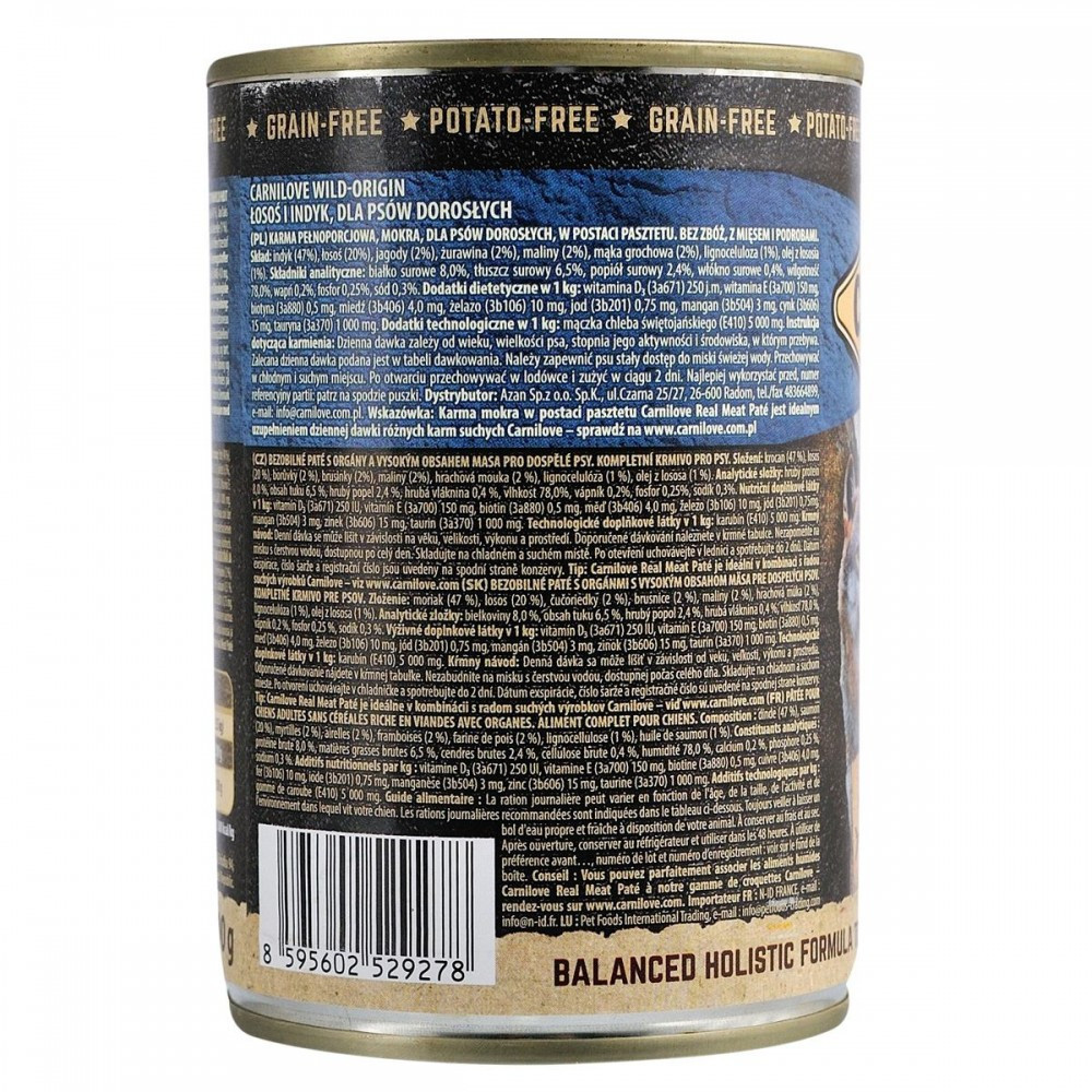 Паштет, що не містить злакових з високою долею м’яса для дорослих собак. Повноцінний корм для собак.Лосось— чудове джерело білків, що гарно засвоюються, а також ненасичених жирних кислот омега-3, які позитивно впливають на розумовий розвиток, серцево-судинну систему та обмін речовин (знижують рівень цукру в крові). Вони також відмінно впливають на якість та зовнішній вигляд шерсті та шкіри.Індичкабагата легкозасвоюваними білками, містить значну кількість мікроелементів, таких як цинк, а також вітамінів В3 і В6, які необхідні для нормального функціонування головного мозку, для підтримання гарного тонусу м’язів та здорового росту.Склад: індичка (47%), лосось (20%), чорниця (2%), журавлина (2%), малина (2%), горохова борошно (2%), лігноцелюлоза (1%), лососевий жир (1%).Харчові добавки на 1 кг:вітамін D3 (3a671) 250 МО, вітамін E (3a700) 150 мг, біотин (3a880) 0,5 мг, мідь (3b406) 4 мг, залізо (3b106) 10 мг, йод (3b201) 0,75 мг, магній (3b504) 3 мг, цинк (3b606) 15 мг, таурин (3a370) 1 000 мг. Технологічні добавки на 1 кг: камедь ріжкового дерева (E410) 5 000 мг.Аналітичний склад на 1 кг:сирий білок 8,0 %, вміст жиру 6,5 %, волога 78,0 %, сира зола 2,4 %, сира клітковина 0,4 %, кальцій 0,2 %, фосфор 0,25 %, натрій 0,3 %.Енергетична цінність:1 080 kcal/kgВага собаки (кг)Добова норма (г/день)Тільки вологийкормКомбіноване годування(сухий+вологий)1-25 кг200-800100-400понад 25 кг800-2200400-1100