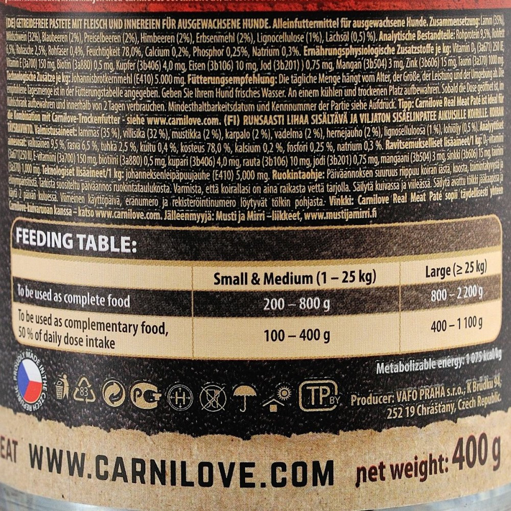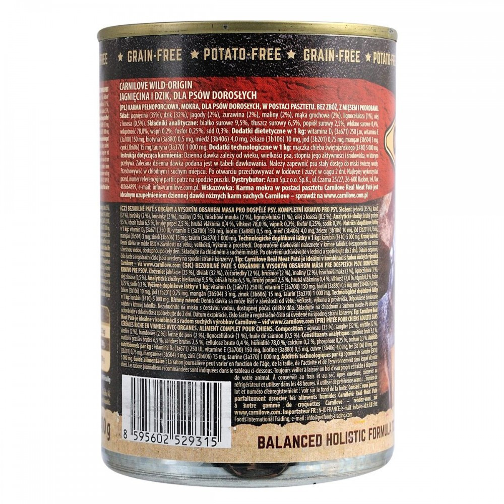 Паштет, що не містить злакових з високою долею м’яса для дорослих собак. Повноцінний корм для собак.Ягня і дикий кабан— це ідеальне поєднання якісних, легкозасвоюваних корисних білків, багате природними поживними речовинами.М’ясо ягнятиє прекрасним джерелом мікроелементів, таких як селен, залізо, цинк, а також вітамінів групи В і ненасичених жирів. М’ясо дикого кабана містить велику кількість білку і мало жиру, ідеально для підтримання оптимального фізичного стану без ризику підвищення рівня холестерину в крові.Склад: ягня (35%), кабан (32%), чорниця (2%), журавлина (2%), малина (2%), горохова борошно (2%), лігноцелюлоза (1%), лососевий жир (0,5%)Харчові добавки на 1 кг:вітамін D3 (3a671) 250 MO, вітамін E (3a700) 150 мг, біотин (3a880) 0,5 мг мідь (3b406) 4 мг, залізо (3b106) 10 мг, йод (3b201) 0,75 мг, магній (3b504) 3 мг, цинк (3b606) 15 мг, таурин (3a370) 1 000 мг. Технологічні добавки на 1 кг: камедь ріжкового дерева (E410) 5 000 мг.Аналітичні компоненти на 1 кг:сирий білок 9,5 %, вміст жиру 6,5 %, волога 78 %, сира зола 2,5 %, сира клітковина 0,4 %, кальцій 0,2 %, фосфор 0,25 %, натрій 0,3 %.Енергетична цінність:1 075 kcal/kgВага собаки (кг)Добова норма (г/день)Тільки вологийкормКомбіноване годування(сухий+вологий)1-25 кг200-800100-400понад 25 кг800-2200400-1100