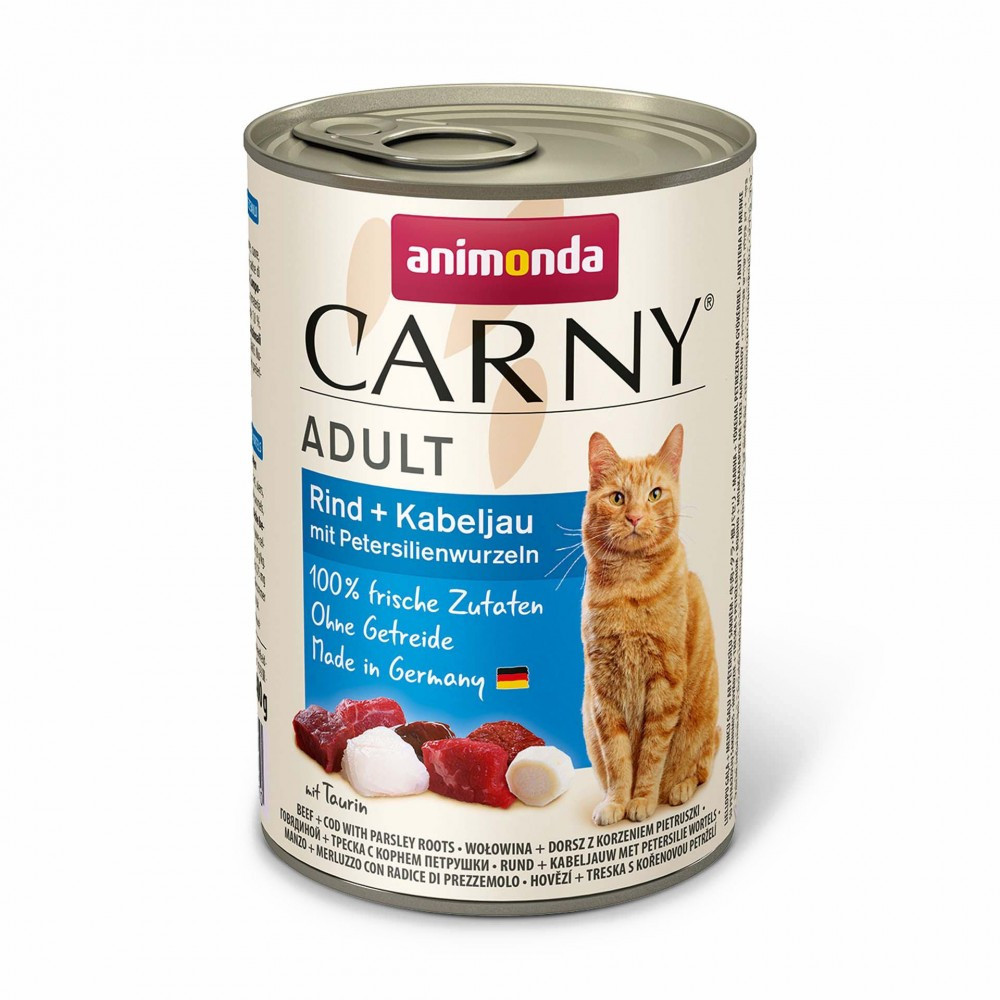Carny Adult Beef + Cod with Parsley Roots – вологий корм, який обожнюють коти! Він виготовлений зі стовідсотково свіжих м’ясних інгредієнтів. Секрет його успіху у поєднанні тріски з яловичиною і з коренями петрушки. Завдяки м’ясу тріски корм містить цінні жирні кислоти омега-3. Тріска дуже легко засвоюється і тому є ідеально легкою їжею для котів. Цей повнораціонний корм підходить для котів від 1 до 6 років і містить усі необхідні вітаміни та мінерали.В процесі виготовлення свіжі м’ясні інгредієнти піддаються лагідній обробці, зберігаючи свій смак і користь. Кожен шматочок корму дарує неповторну насолоду від прийому їжі. Carny Adult Beef + Cod with Parsley Roots не містить зерна, сої та цукру.Особливості корму:частка м’ясних інгредієнтів – 65%;з натуральним таурином;зі смачними коренями петрушки;без штучних барвників і консервантів;є природним джерелом кальцію;для котів 1-6 років.Ви шукаєте смачний і збалансований корм для свого улюбленця? Обирайте Carny Adult — м’ясну насолоду для кожного котика!Рекомендації з годування:добова порція для кота вагою 3 кг становить 175 г корму. Якщо улюбленець важить 4 кг, рекомендована кількість – 200 г, якщо він важить 5 кг, то порцію варто збільшити до 245 г.Склад:45% яловичина (печінка, легені, серце, вим’я, м’ясо, нирки), 20% тріска, 2% коріння петрушки, карбонат кальцію, хлорид натрію.Аналітичний склад:білок 11,5 %, жир 6,5 %, сира клітковина 0,5 %, сира зола 1,8 %, вологість 79 %, таурин 0,8 г/кгХарчові добавки:0,75 мг безводний йодат кальцію (3b202), 14 мг сульфат марганцю моногідрат (3b503), 25 мг моногідрат сульфату цинку (3b605)Енергетична цінність на 100 г у МДж: 0,44