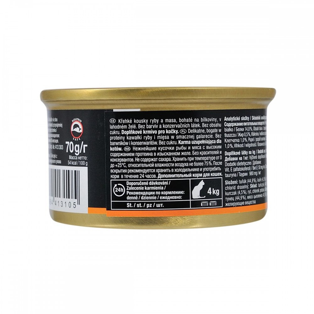 Консерви для котів Shiny Cat тунець і курка – делікатесний вологий корм, готовий до споживання. Виготовлений з високоякісного м’яса тунця і курки. Не містить штучних барвників, підсилювачів смаку, консервантів і ГМО.Використання найновіших високотехнологічних рецептур дозволило максимально зберегти вміст вихідного продукту, вітаміни і мінеральні речовини. Захоплюючий смак та аромат свіжих апетитних шматочків риби та м’яса подарують миті кулінарного щастя вашим улюбленцям.Рекомендації з годування:для кошенят та дрібних котів – 1 банка, для середніх котів – 2 банки, для великих котів – 3 банки на день.Склад: тунець (44,9%), курка (4,5%), рис, хлорид калію.Харчові добавки: вітамін E – 50 мг, таурин – 980 мг.