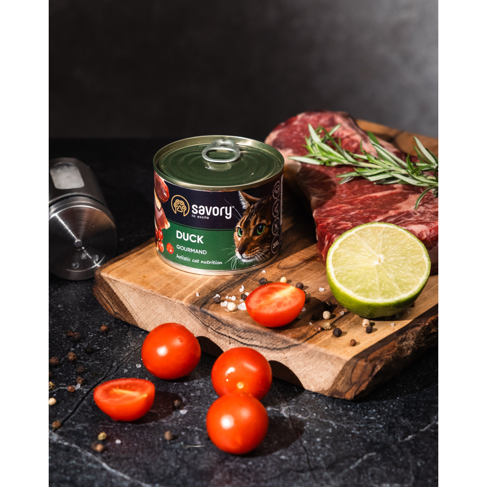 Повнораціонний вологий корм з качкою для котів. Ексклюзивна рецептура корму була розроблена досвідченими європейськими спеціалістами з харчування домашніх улюбленців.Використовуючи холістичний підхід, вдалося створити біологічно відповідний, здоровий раціон для котів, який є корисним і смачним настільки, що лапки оближеш. Поєднання добірних натуральних інгредієнтів дає можливість піклуватися про здоров’я чотирилапого, а вишуканий смак – дарувати йому насолоду від щоденного споживання корму Savory.Вологий корм Savory з качкою для котів забезпечує оптимальне функціонування всього організму улюбленця.Переваги:Високий відсоток вмісту м’яса: корм легко засвоїться, забезпечивши організм улюбленця максимумом поживних речовин.М’ясо качки – цінне джерело білків, яке надає корму неперевершеного смаку.Таурин – це амінокислота, що не виробляється організмом котиків, але життєво необхідна для правильного функціонування їх організму.Багаті на антиоксиданти, вітаміни і флавоноїди ягоди поліпшують роботу нирок та сечовивідних шляхів.Без глютену.Не містить штучних барвників і штучних ароматизаторів – підхід «NafNac».Особливості:Качка – це ідеальний амінокислотний склад та швидкозасвоюваний гіпоалергенний білок.Курячі серця та шлунки – джерело білка з мінімальним вмістом жиру.Печінка містить вітаміни групи В для нормалізації процесів метаболізму.Сушена журавлина – це антиоксиданти і біофлавоноїди, які попереджують розвиток шкідливої мікрофлори в сечовидільній системі. Вона допомагає підтримувати здоров’я сечовивідних шляхів, регулює кислотність сечі та є хорошим кишковим антисептиком.Сушена обліпиха зміцнює імунітет, сприятливо впливає на роботу нирок і серця.Корм Savory – корисне може бути смачним!Склад: качка (36%), курячі шлунки (14%), курячі серця (14%), печінка (12%), горохове борошно, лігноцелюлоза (органічна клітковина), карбонат кальцію, сушена журавлина (контроль рН сечі) (0,1%), сушена обліпиха (0,1%), сушена котяча м’ята (антистресовий ефект)(0,1%).Аналітичний склад:сирий білок 9,0%, сирий жир 5,0%, сира зола 2,5%, вологість 78,0%, клітковина 0,8%.Харчові добавки на 1 кг:вітамін D3 (3а671) 200 МО, вітамін Е (3а700) 100 мг, біотин (3а880) 0,2 мг, цинк (3b606) 12 мг, залізо (3b106) 10 мг, марганець (3b504) 1,5 мг, йод (3b201) 0,5 мг, мідь (3b406) 0,5 мг, таурин (3а370) 550 мг, кальцій (Ca) 0,25%, фосфор (P) 0,3%, натрій (Na) 0,4%.Енергетична цінність:985 ккал/кгВага улюбленцяНорма паштету при харчуванні лише вологим кормом (грамів паштету на день)Норма паштету при комбінованому харчуванні із сухим кормом (грамів паштету на день)2 кг180903 кг2101055 кг2601307 км300150*норми годування є середньостатистичними, та можуть корегуватися на +-20% в залежності від активності улюбленця, метаболізму та температур навколишнього середовища