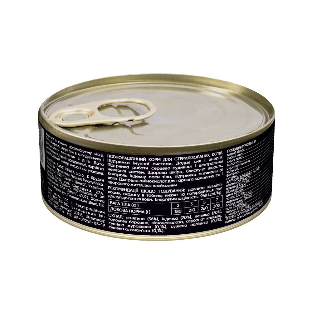 Ексклюзивна рецептура корму була розроблена досвідченими європейськими спеціалістами з харчування домашніх улюбленців.Використовуючи холістичний підхід, вдалося створити біологічно відповідний, здоровий раціон для котів, який є корисним і смачним настільки, що лапки оближеш. Поєднання добірних натуральних інгредієнтів дає можливість піклуватися про здоров’я чотирилапого, а вишуканий смак – дарувати йому насолоду від щоденного споживання корму Savory.Вологий корм Savory для стерилізованих котів – це профілактика сечокам’яної хвороби, підтримка оптимальної ваги та захист імунітету котика.Переваги:Високий відсоток вмісту м’яса: корм легко засвоїться, забезпечивши організм улюбленця максимумом поживних речовин.М’ясо ягняти та індички – цінне джерело білків, яке надає корму неперевершеного смаку.Таурин – це амінокислота, що не виробляється організмом котиків, але життєво необхідна для правильного функціонування їх організму.Без глютену.Багаті на антиоксиданти, вітаміни і флавоноїди ягоди поліпшують роботу нирок та сечовивідних шляхів.L-метіонін підтримує оптимальний рівень кислотності сечі для профілактики сечокам’яної хвороби.Не містить штучних барвників і штучних ароматизаторів – підхід «NafNac».Особливості:М’ясо ягняти – гіпоалергенне та низькокалорійне джерело білка, містить велику кількість вітамінів та мікроелементів.Індичка – високобілкове дієтичне м`ясо, яке легко засвоюється і має у своєму складі життєво важливі мінерали: селен, цинк, натрій, фосфор, магній, калій та вітаміни групи B.Печінка містить вітаміни групи В для нормалізації процесів метаболізму.Сушена журавлина – це антиоксиданти і біофлавоноїди, які попереджують розвиток шкідливої мікрофлори в сечовидільній системі. Вона допомагає підтримувати здоров’я сечовивідних шляхів, регулює кислотність сечі та є хорошим кишковим антисептиком.Сушена обліпиха зміцнює імунітет, сприятливо впливає на роботу нирок і серця.Корм Savory – корисне може бути смачним!Склад: ягнятина (36%), індичка (20%), печінка (20%), горохове борошно, лігноцелюлоза (органічна клітковина), карбонат кальцію, сушена журавлина (контроль рН сечі) (0,1%), сушена обліпиха (0,1%), сушена котяча м’ята (антистресовий ефект) (0,1%).Аналітичний склад:сирий білок 9,0%, сирий жир 3,5%, сира зола 2,3%, вологість 78,0%, клітковина 0,8%.Харчові добавки на 1 кг:вітамін D3 (3а671) 200 МО, вітамін Е (3а700) 100 мг, біотин (3а880) 0,2 мг, цинк (3b606) 12 мг, залізо (3b106) 10 мг, марганець (3b504) 1,5 мг, йод (3b201) 0,5 мг, мідь (3b406) 0,5 мг, таурин (3а370) 550 мг, L-метіонін (3с305) 400 мг, кальцій (Ca) 0,25%, фосфор (P) 0,3%, натрій (Na) 0,4%.Енергетична цінність:958 ккал/кгВага улюбленцяНорма паштету при харчуванні лише вологим кормом (грамів паштету на день)Норма паштету при комбінованому харчуванні із сухим кормом (грамів паштету на день)2 кг180903 кг2101055 кг2601307 км300150*норми годування є середньостатистичними, та можуть корегуватися на +-20% в залежності від активності улюбленця, метаболізму та температур навколишнього середовища