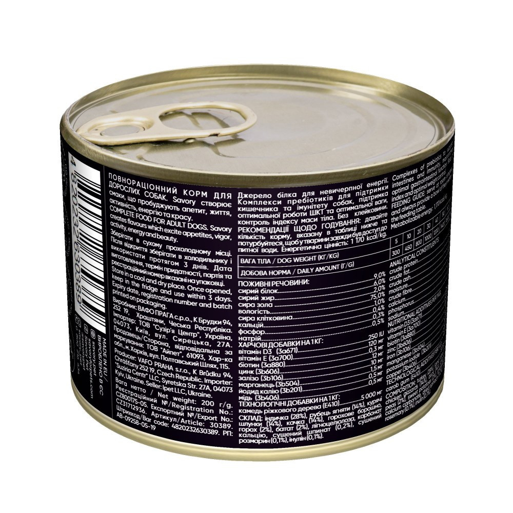 Повнораціонний вологий корм з чотирма видами м’яса для дорослих собак усіх порід. Корм для собак Savory пробудить у вашого улюбленця ту життєву енергію, про яку він навіть сам ще не знав.Ексклюзивна рецептура корму була розроблена досвідченими європейськими спеціалістами з харчування домашніх улюбленців. Використовуючи холістичний підхід, вдалося створити біологічно відповідний, здоровий раціон для собак, який є корисним і смачним настільки, що лапки оближеш. Поєднання добірних натуральних інгредієнтів дає можливість піклуватися про здоров’я чотирилапого, а вишуканий смак – дарувати йому насолоду від щоденного споживання корму Savory.Переваги:Високий відсоток вмісту м’яса: корм легко засвоїться, забезпечивши організм улюбленця максимумом поживних речовин.Пребіотик інулін нормалізує процеси травлення у чотирилапого, зміцнюючи імунну систему.М’ясо індички та качки – цінне джерело білків, яке надає корму неперевершеного смаку.Без глютену.Не містить штучних барвників і штучних ароматизаторів – підхід «NafNac».Особливості:Поєднання чотирьох видів м’яса забезпечує песика життєво важливими білками й амінокислотами, потрібними для чудового самопочуття і бадьорості.Горох повільно вивільняє енергію, що дає відчуття ситості чотирилапому. Ще ця бобова культура багата протеїнами, які необхідні для розвитку і підтримки мускулатури у відмінному стані.Солодка картопля – це складні вуглеводи, які надовго втамовують голод, та клітковина для нормальної роботи кишечника.Зі шпинату собака отримує антиоксиданти для здоров’я серця і суглобів, красивої шерсті, а вітаміни групи В нормалізують процеси метаболізму.Корм Savory – корисне може бути смачним!Склад: індичка (28%), рубець ягняти (14%), курячі шлунки (14%), качка (14%), горохове борошно, горох (2%), солодка картопля (2%), лігноцелюлоза (органічна клітковина), карбонат кальцію, сушений шпинат (0,2%), сушений розмарин (0,1%), пребіотик інулін (0,1%).Аналітичний склад:сирий білок 9,0%, сирий жир 6,0%, сира зола 2,0%, вологість 75,0%, клітковина 1,0%Харчові добавки на 1 кг:вітамін D3 (3а671) 250 МО, вітамін Е (3а700) 120 мг, біотин (3а880) 0,3 мг, цинк (3b606) 12 мг, залізо (3b106) 10 мг, марганець (3b504) 1,5 мг, йод (3b201) 0,5 мг, мідь (3b406) 0,5 мг, кальцій (Ca) 0,4%, фосфор (P) 0,3%, натрій (Na) 0,5%Енергетична цінність:1170 ккал/кгВага улюбленцяНорма паштету при харчуванні лише вологим кормом (грамів паштету на день)Норма паштету при комбінованому харчуванні із сухим кормом (грамів паштету на день)2.5 кг180905 кг30015010 кг45022520 кг80040030 кг100050040 кг120060050 кг140070060 кг160080070 кг1800900*норми годування є середньостатистичними, та можуть корегуватися на +-20% в залежності від активності улюбленця, метаболізму та температур навколишнього середовища