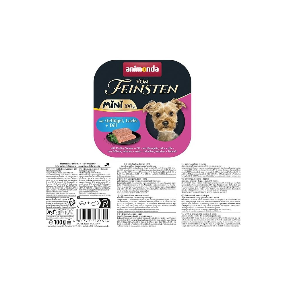 Побалуйте свого мініатюрного гурмана вишуканим вологим кормом Animonda Vom Feinsten Adult Mini з птицею, лососем та кропом! Цей корм створений спеціально для дорослих собак дрібних порід, пропонуючи таким песикам неперевершений смак та повноцінне харчування в зручних порційних упаковках.Чому Animonda Vom Feinsten Adult Mini – ідеальний вибір?Високоякісні м’ясні інгредієнти.Вишуканий смак з ароматними травами.Натуральні інгредієнти, без зайвого: не містить зерна, цукру, сої, штучних барвників та консервантів.Зручні порції.Даруйте своєму маленькому другу справжню насолоду з кожним прийомом їжі! Animonda Vom Feinsten Adult Mini — це не просто корм, а турбота про здоров’я та щастя вашого улюбленця.Склад: 62% м’яса та продуктів тваринного походження (свинина, 8% птиця), риба та рибні продукти (4% лосось), мінерали, 0.1% кріп.Аналітичний склад: білок: 10.5%, вміст жиру: 5%, сира клітковина: 0.3%, сира зола: 2%, волога: 81%.Харчові добавки на кг: вітамін D3: 150 МО, мідь (у вигляді амінокислотного хелату міді): 1 мг, сульфат цинку моногідрат: 26 мг, сульфат марганцю моногідрат: 1.7 мг, йодат кальцію: 0.4 мг.Калорійність на 100 г: 0.37 МДж.Рекомендації щодо годування:для песиків вагою 2 кг потрібно 180 г корму;для собак вагою 4 кг – 300 г корму;для улюбленців 6 кг – 415 г корму;для хвостиків 8 кг – 515 г корму.