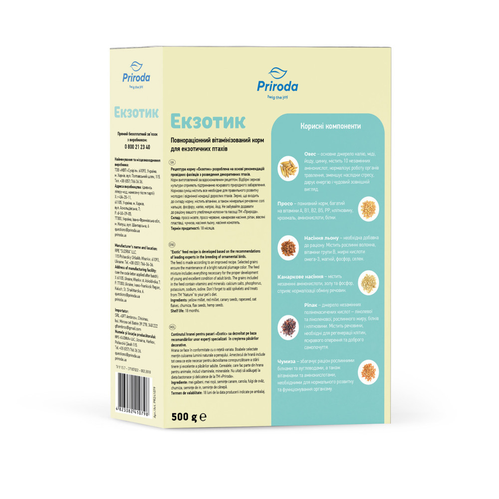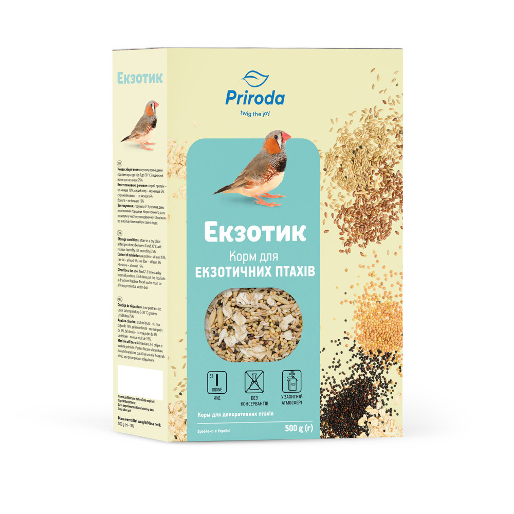Рецептура корму «Екзотик» розроблена на основі рекомендацій провідних фахівців з розведення декоративних птахів. Корм виготовлений за вдосконаленим рецептом.Відбірні зернові культури сприяють підтриманню яскравого природного забарвлення. Кормова суміш містить все необхідне для правильного розвитку молодих і відмінної кондиції дорослих птахів. Зерно, що входить до складу корму, містить вітаміни, а також мінеральні речовини: солі кальцію, фосфору, калію, натрію, йод.Застосування: годувати 2-3 рази на день невеликими порціями. Корм кожного разу насипати у чисту суху годівничку. Обов’язково в поїлці повинна бути свіжа вода.Склад: просо жовте, просо червоне, ріпак, канаркове насіння, вівсяні пластівці, чумиза, насіння льону, насіння конопель.