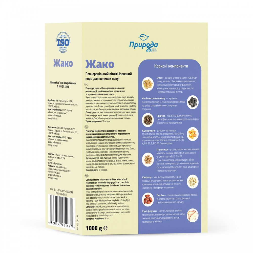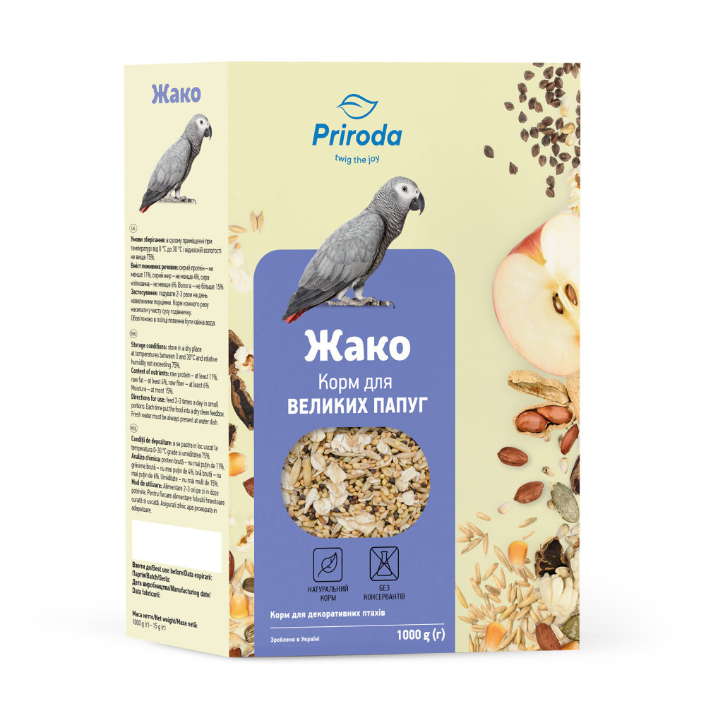 Рецептура корму «Жако» розроблена на основі рекомендацій провідних фахівців з розведення та утримання декоративних птахів. Корм складено за рецептами власників великих папуг, які мають великий досвід в розведенні та утримуванні птахів.Корм містить необхідні компоненти для нормального розвитку молодих та відмінного стану дорослих птахів. Горіхи, сушені фрукти, кероб та попкорн – улюблені ласощі птахів, які збагачують раціон вітамінами, вуглеводами, білками.Застосування: годувати 2-3 рази на день невеликими порціями. Корм кожного разу насипати у чисту суху годівничку. Обов’язково в поїлці повинна бути свіжа вода.Склад: насіння конопель, кукурудза, овес, арахіс, насіння соняшнику сірого, пшениця, насіння гарбуза, яблука сушені, ячмінь, насіння соняшнику, гречка, кероб, сафлор, попкорн.