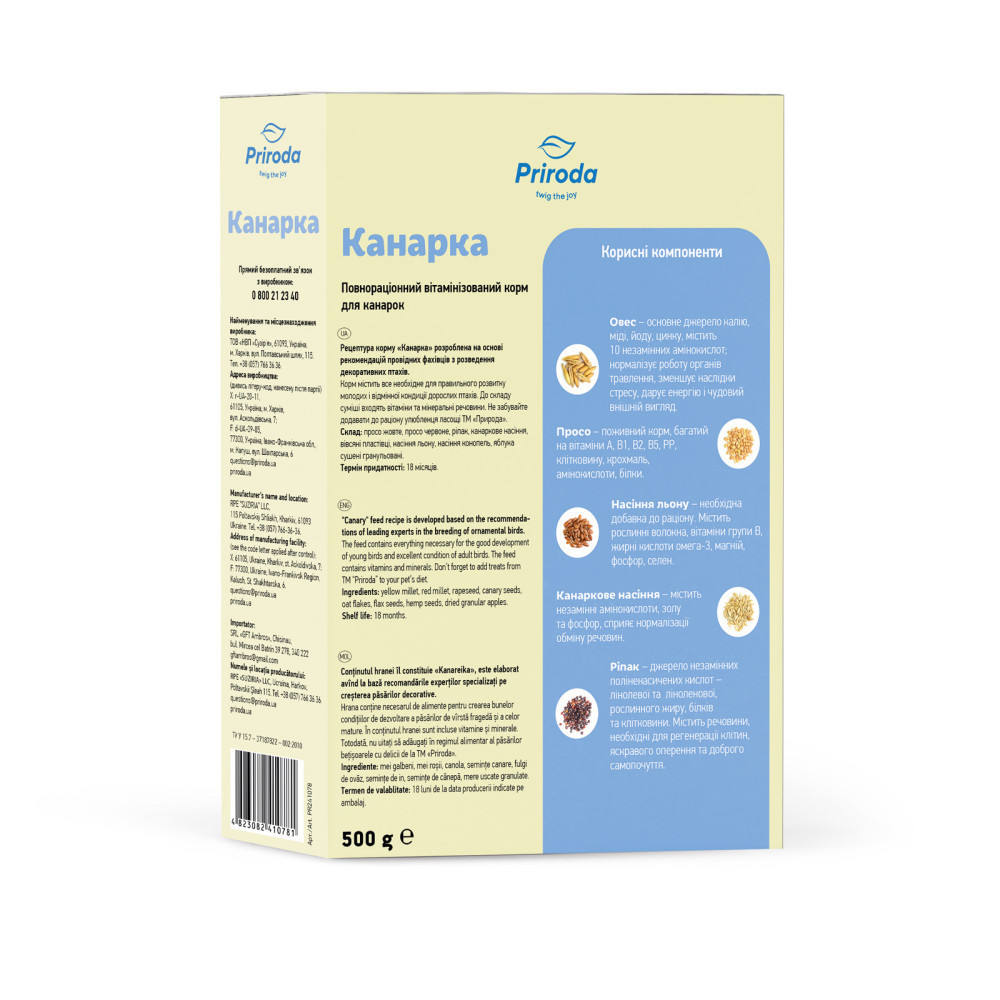 Рецептура корму «Канарка» розроблена на основі рекомендацій провідних фахівців з розведення декоративних птахів.Корм містить все необхідне для правильного розвитку молодих і відмінної кондиції дорослих птахів. Крім відбірного зерна до складу суміші входять смакові добавки, вітаміни, а також мінеральні речовини: солі кальцію, фосфору, калію, натрію, йод.Застосування: годувати 2-3 рази на день невеликими порціями. Корм кожен раз насипати у чисту суху годівничку. Обов’язково в поїлці повинна бути свіжа вода.Склад: ріпак, просо жовте, просо червоне, канаркове насіння, вівсяні пластівці, насіння льону, насіння конопель, яблука сушені гранульовані.