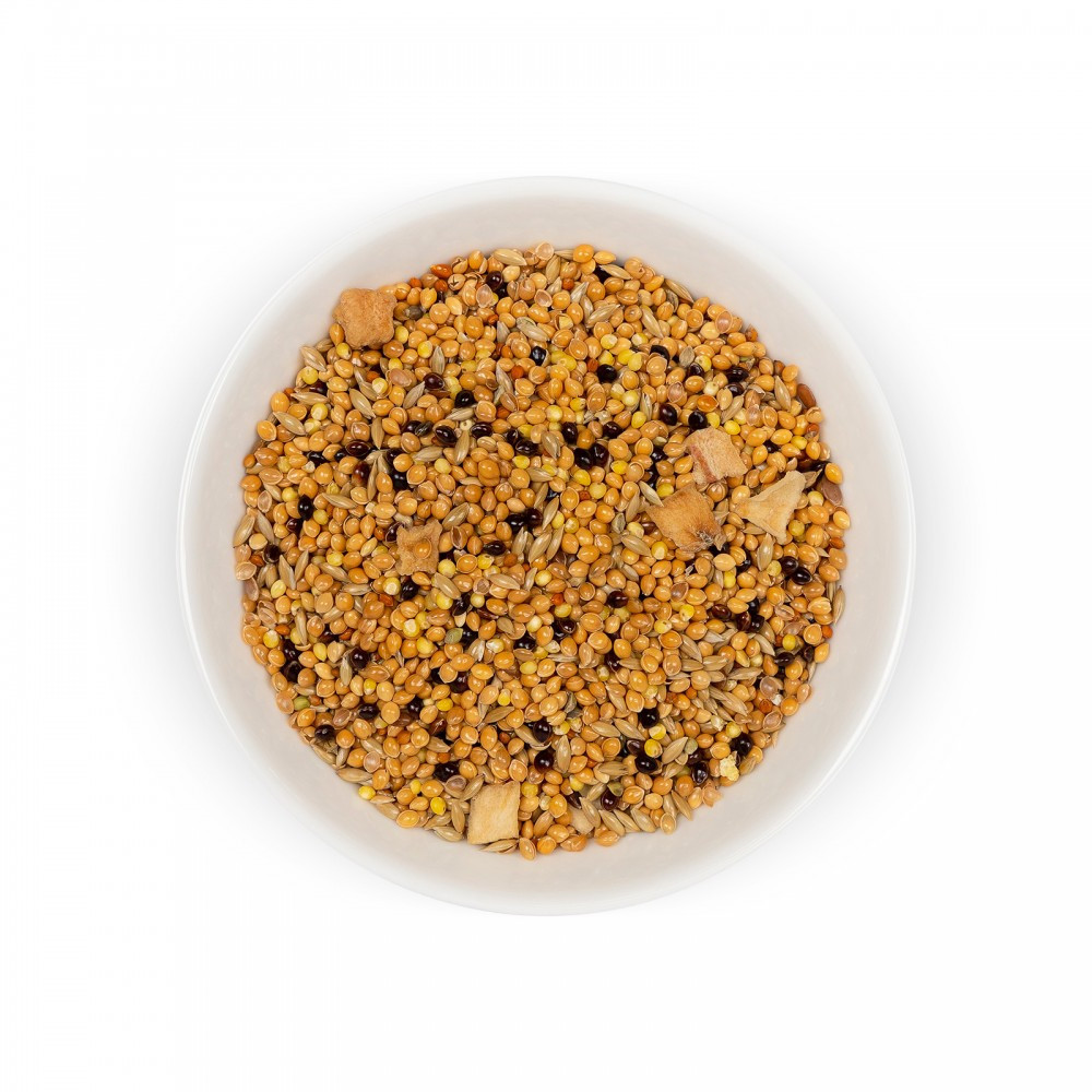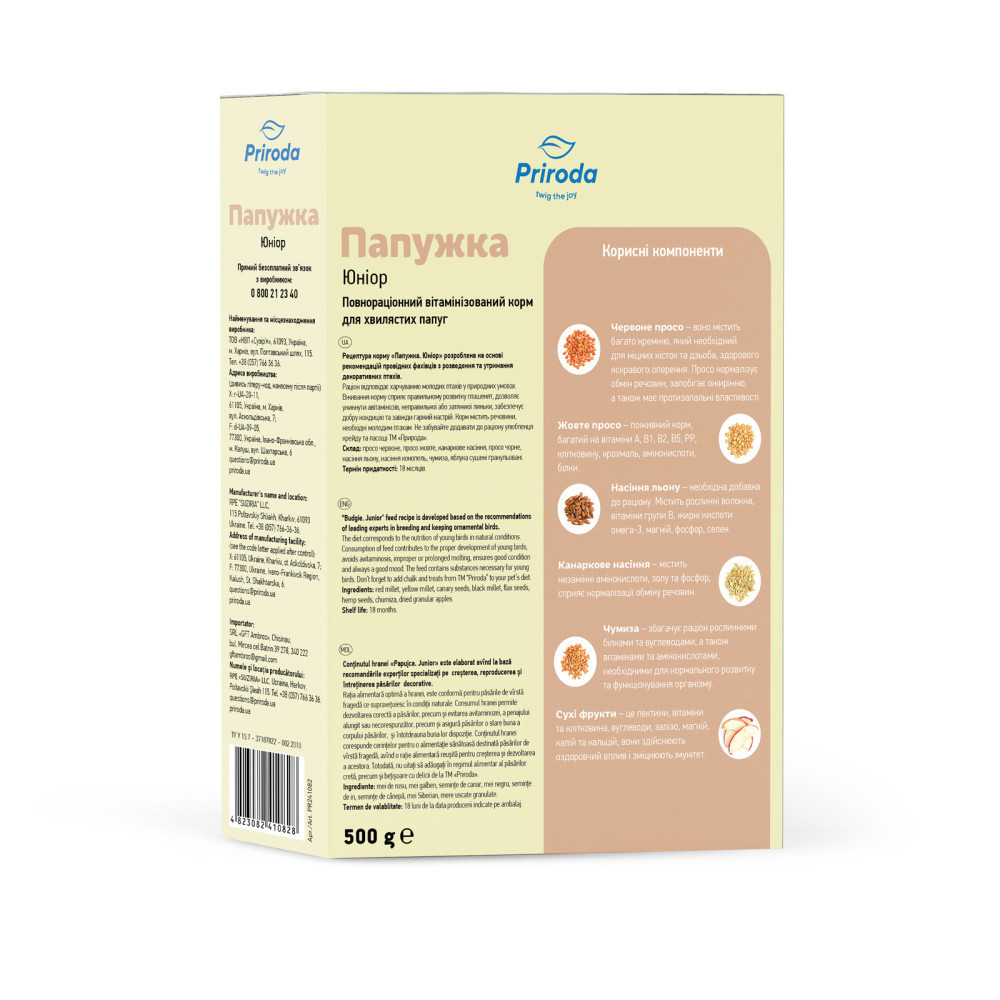 Рецептура корму «Папужка « Юніор» розроблена на основі рекомендацій провідних фахівців з розведення та утримання декоративних птахів. Суміш зернових культур становить раціон, що відповідає харчуванню молодих птахів у природних умовах.Вживання корму сприяє правильному розвитку молодих птахів, дозволяє уникнути авітамінозів, неправильної або затяжної линьки, забезпечує добру кондицію, яскраве забарвлення та завжди гарний настрій. Корм містить речовини, необхідні молодим птахам для правильного розвитку. Йод нормалізує обмін речовин.Застосування: годувати 2-3 рази на день невеликими порціями. Корм кожного разу насипати у чисту суху годівничку. Обов’язково в поїлці повинна бути свіжа вода.Склад: просо жовте, просо червоне, канаркове насіння, просо чорне, чумиза, насіння льону, насіння конопель, сушене яблуко