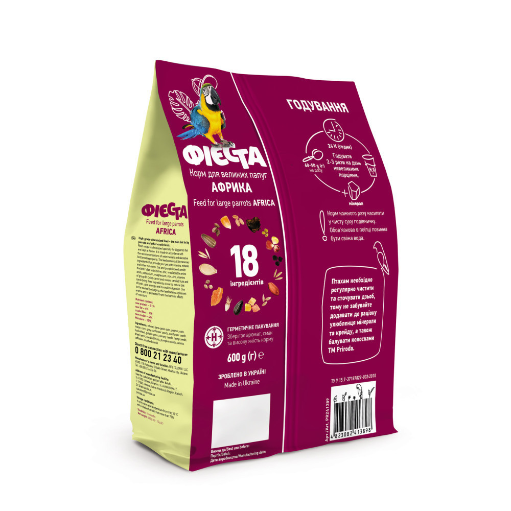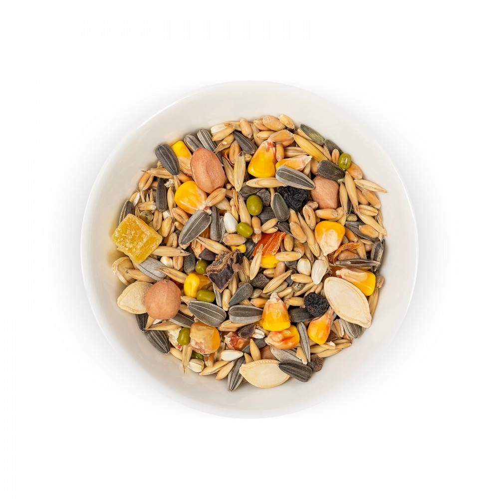 Повноцінний вітамінізований корм – основний раціон для великих папуг. Рецептура корму розроблена спеціально для великих папуг, які утримуються в домашніх умовах. Вона складена у відповідності до рекомендацій ветеринарів та фахівців з розведення декоративних птахів.Корм містить всі необхідні компоненти, які забезпечують улюбленців вітамінами, мінералами та іншими корисними речовинами. Овес та насіння гарбуза збагачують раціон птахів йодом, цинком, незамінними амінокислотами, калієм, магнієм, залізом, цинком, вітамінами групи В.Сушені яблука, горобина, виноград і кероб наближають склад корму до природного раціону птахів, дарують енергію та нормалізують травлення. Завдяки герметичній упаковці корм зберігає приємний аромат і захищений від шкідливої дії вологиСклад: насіння конопель, маїс, арахіс, кукурудза, насіння соняшнику, насіння соняшнику сіре, маш, цукати, пшениця, насіння гарбуза, сушена морква, канаркове насіння, кероб подрібнений, овес, гречка, овес голозерний, горобина, сафлор.Рекомендації: Годувати птахів 2-3 рази на день невеликими порціями, корм кожного разу насипати в чисту суху годівницю. Слідкуйте за тим, щоб в поїлці завжди була свіжа вода.